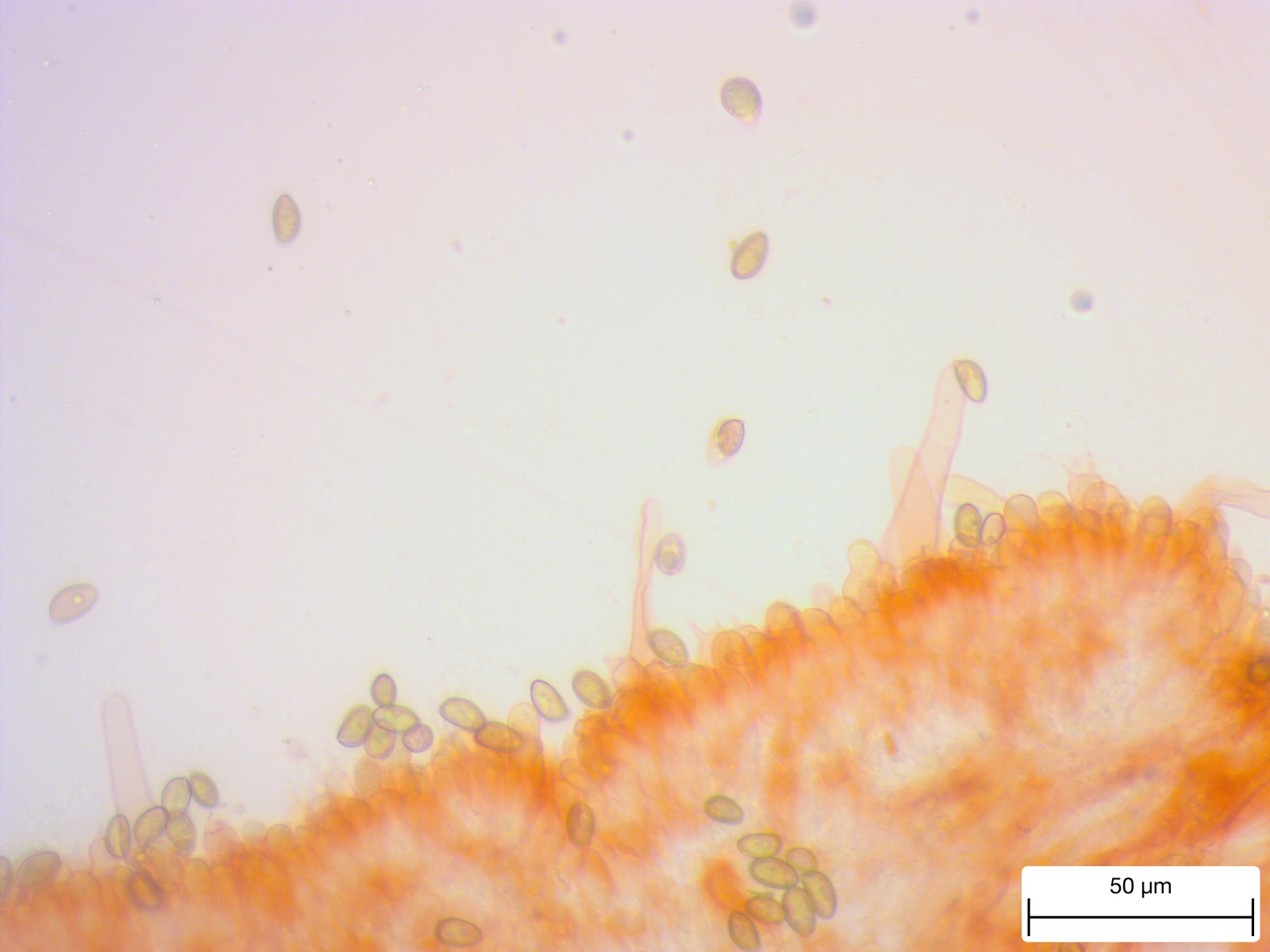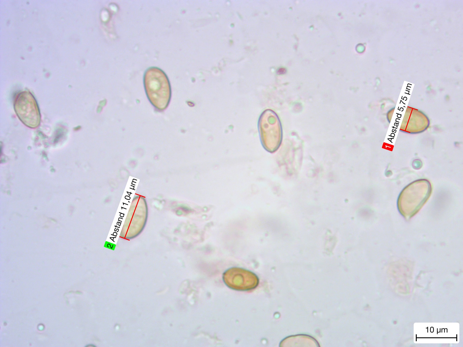 Sporenpulver hat er nicht abgegeben, unterm Mikroskop waren braune Sporen erkennbar. 5,5 breit - 10-11lang