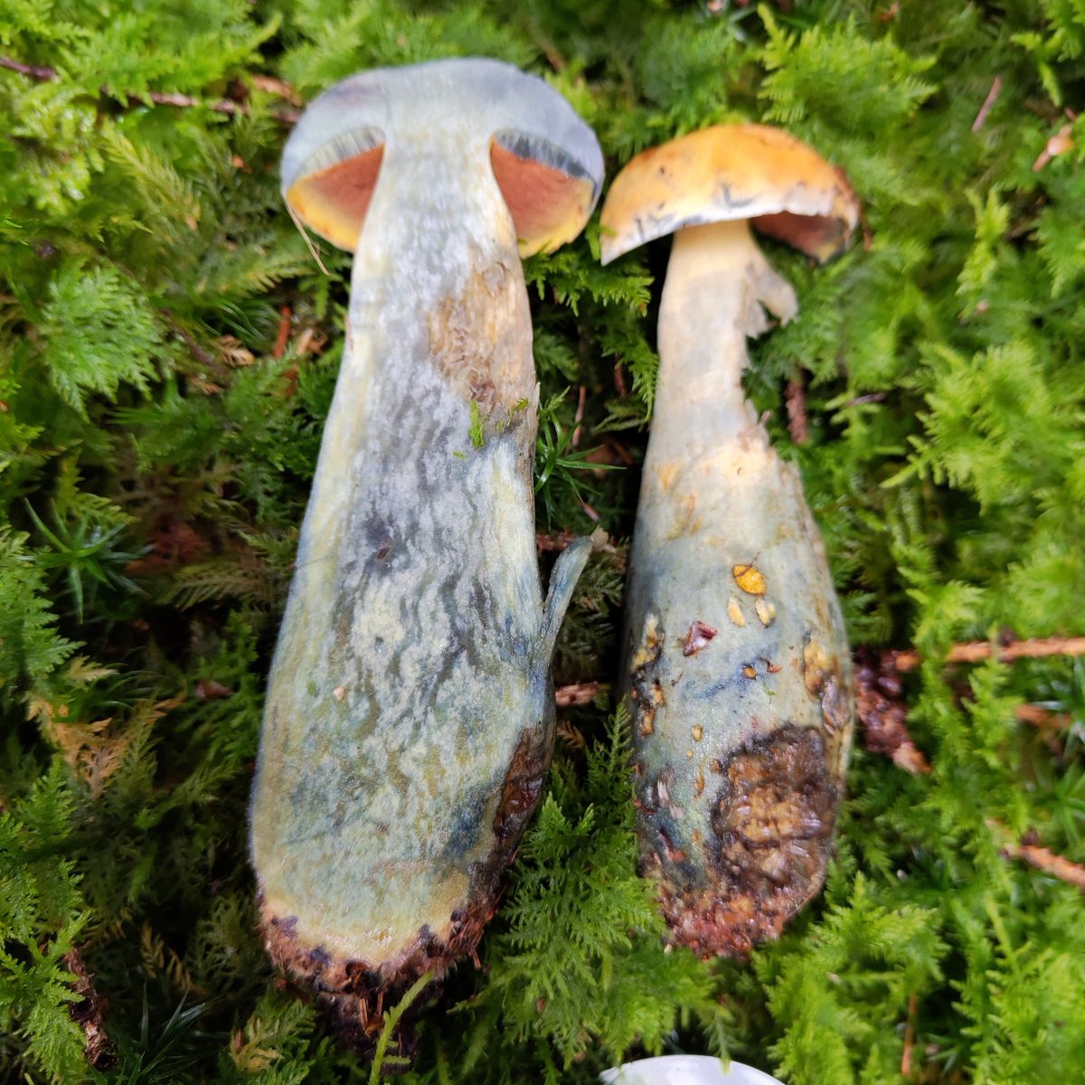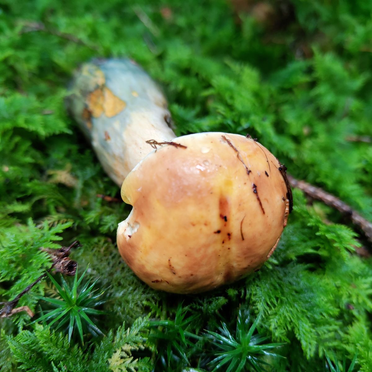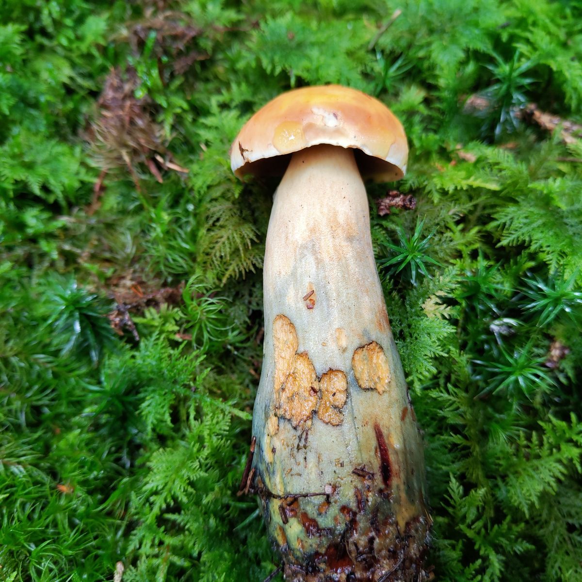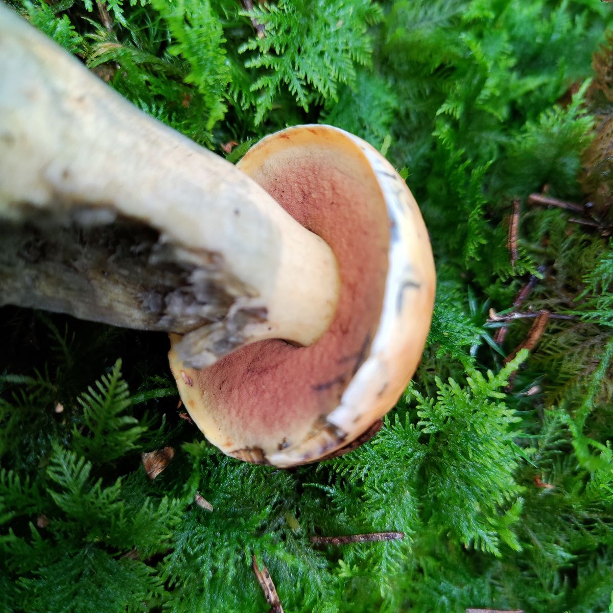 gestern im Oberen Vogtland im saueren Fichtenwald gefunden, moosiger Boden. Neoboletus erythropus scheint klar. Paar "normal" aussehende Flockis standen in der Nähe. Der FK war mittelgroß, Hutdurchmesser c.a. 6cm. Könnte das ne semixanthoide Forma sein was mich dann zum Taxon ... discolor führen würde falls das überhaupt gültig ist ?