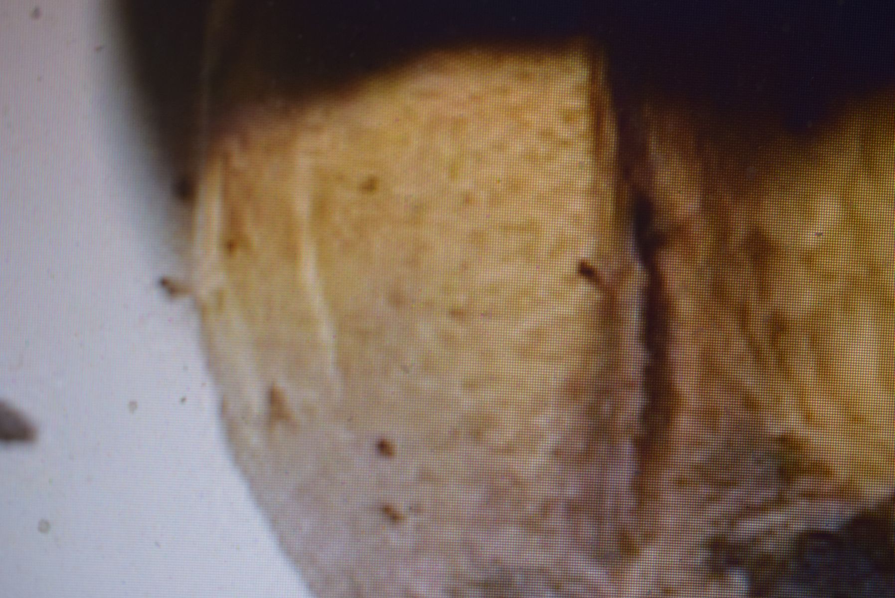 rund, hellbraun-gräulich, nicht überall die selbe Farbe, nicht schleimig, eher trocken