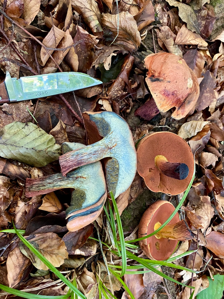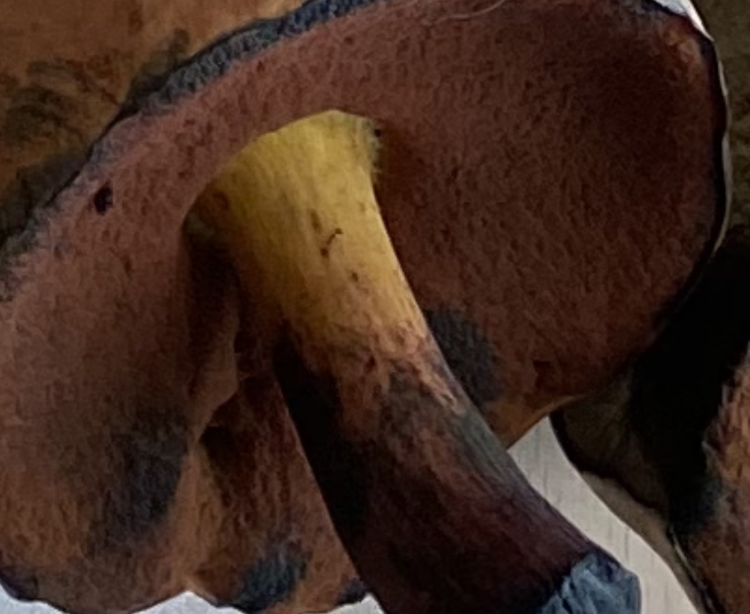 Ein Freund meinte sofort: netzstieliger Hexenröhrling; allerdings kann ich kein Netz im klassischen Sinne erkennen. Auffällig ist für mich auch dass die Röhren am Stil nicht angewachsen sind.