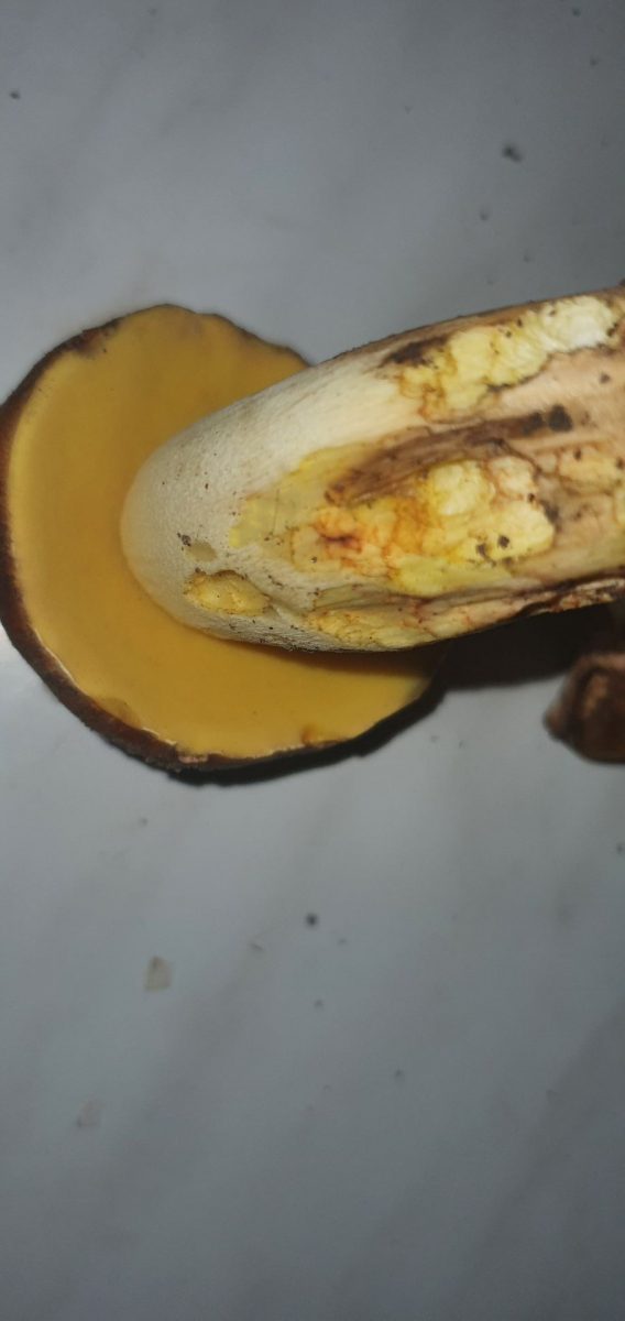 Gelbliche Färbung direkt nach Anschnitt stärker, läßt mit der Zeit nach und ist dann nur im Randbereich des Stiels stärker gelblich und am Übergang zum Hut, hier im Anschnitt kein blauen zu sehen, kann aber laut Literatur mal mehr mal weniger stark ausfallen. Bei Maronen kenne ich das auch bei den kleineren ganz festen so.