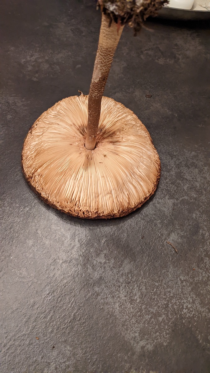 Allerdings bin ich mir nicht ganz sicher, ob es sich hier um einen gemeinen Riesenschirmling handelt. Da er extrem dunkelbraun ist, keinen Ring mehr hatte (fällt dieser manchmal ab?) und das Fleisch unter der Natterung nicht mehr weiß ist sondern auch eher hellbraun.