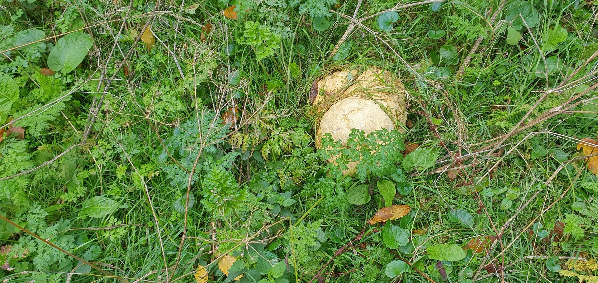 1. Calvatia gigantea, etwa gut 20cm Druchmesser, etwas oval, schon älter