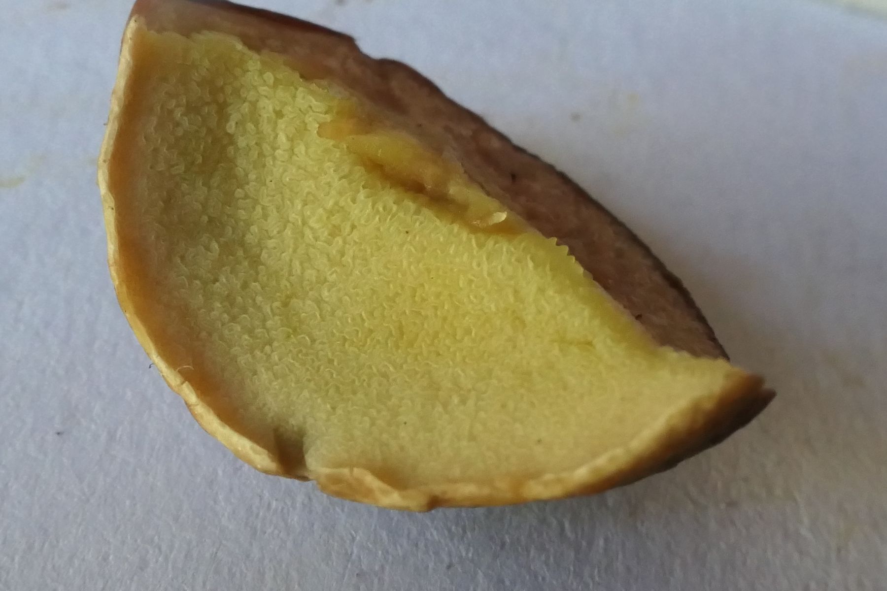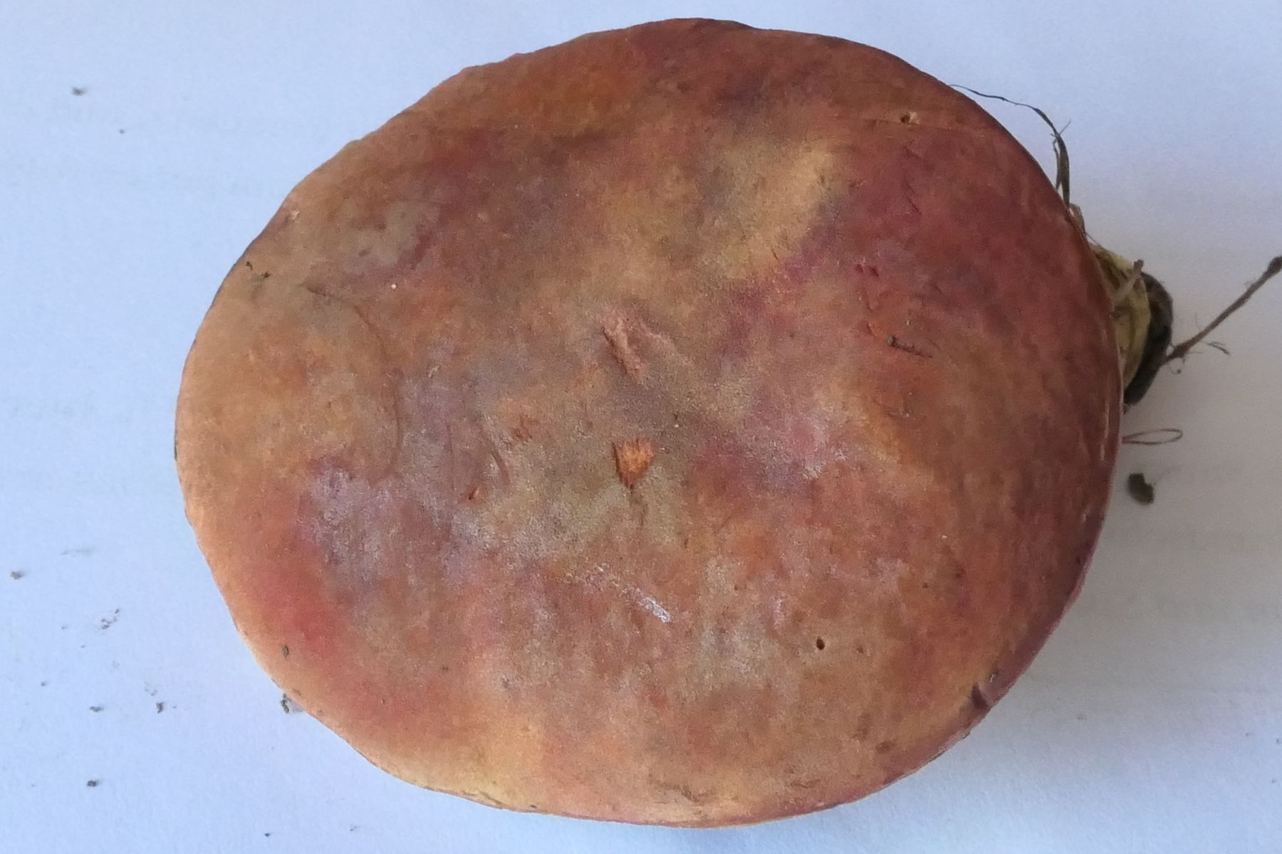 Hut 7 cm, jung halbkugelförmig, dann abgeflacht-polsterförmig; Rand bei jungem Exemplar deutlich eingerollt; Braun mit Olivton; Oberfläche samtig-filzig, wildlederartig; keine rote Unterhaut; keine aufgerissene Huthaut; jung dunkelbraun