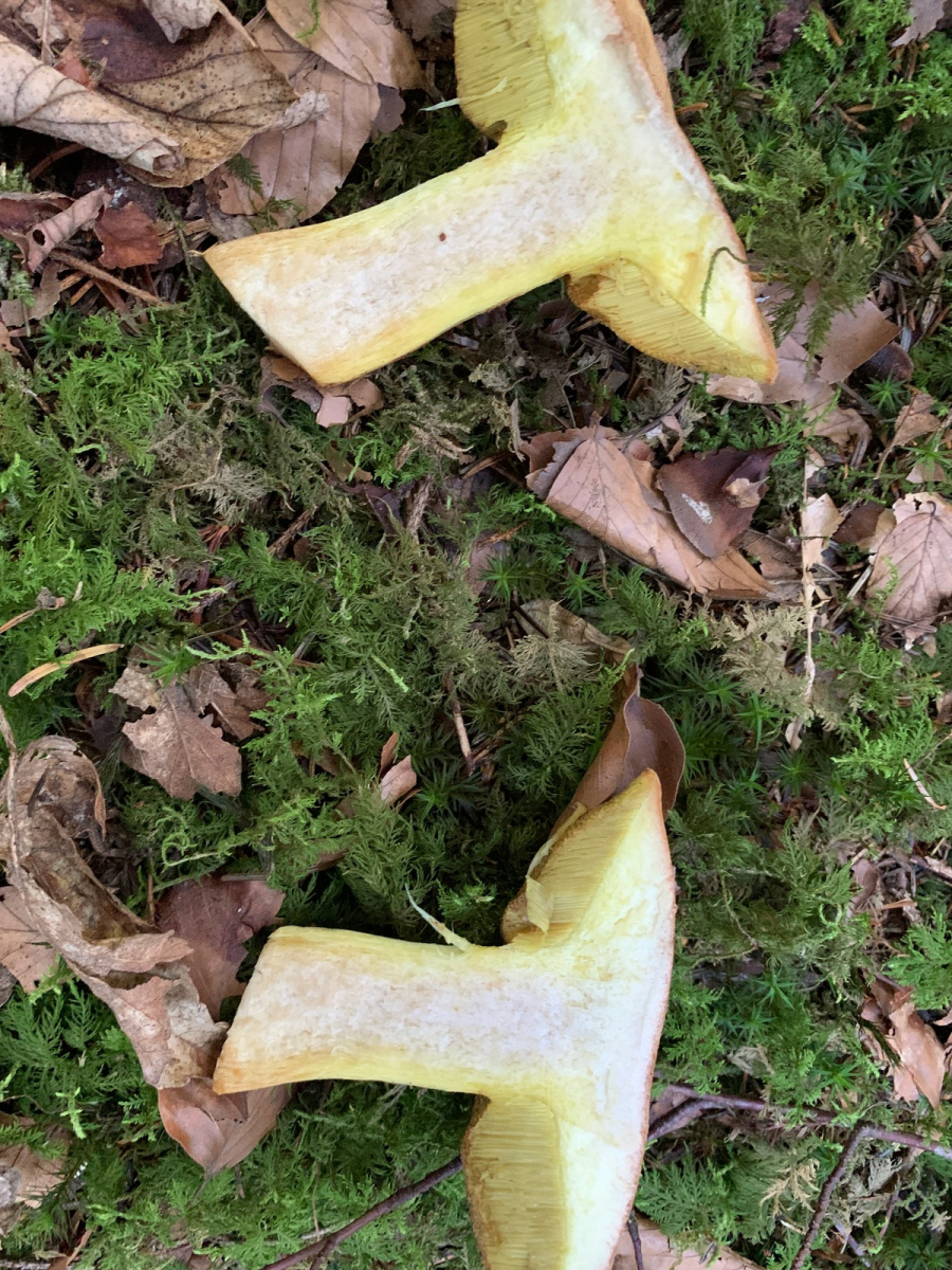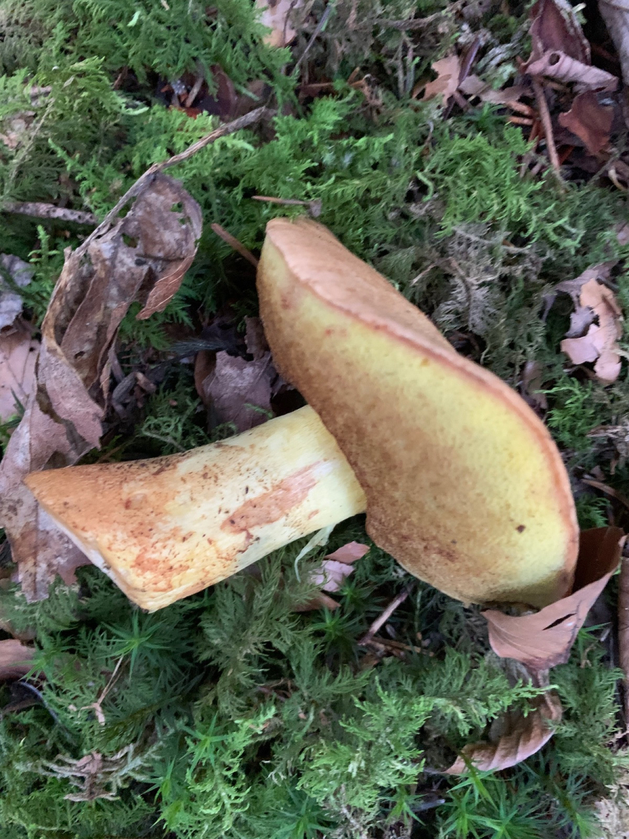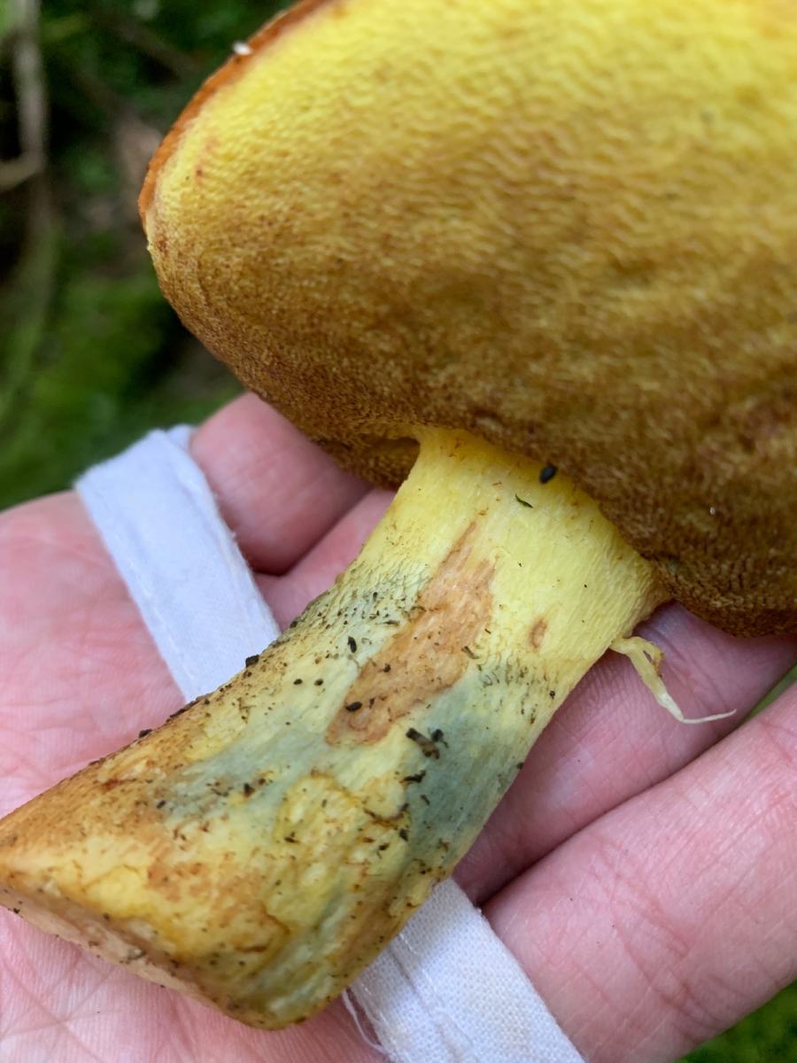 Ich habe heute auf der Ostalb diesen Röhrling gefunden, unter eingestreuter Buche im etwas wärmeren Fichten/Tannenwald, eine Birke war aber auch in der Nähe. Das Fleisch bläut nicht, sondern rötet sehr langsam, Druckstellen am Stiel blauen. An der Stielspitze ist ein feines gelbes Netz, er riecht schwach und schmeckt mild.