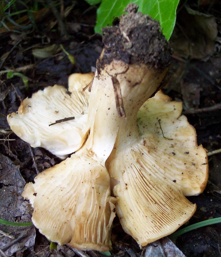 Pilz 2: Ich schätze ein Maipilz (Calocybe gambosa). Ein einzelnes, altes Exemplar am Wegesrand. Ich glaube, er hatte keinen Mehl-/Gurkengeruch, bin mir aber nicht sicher. Die Risspilze würde ich aber ausschließen, denn der Hut war glatt.