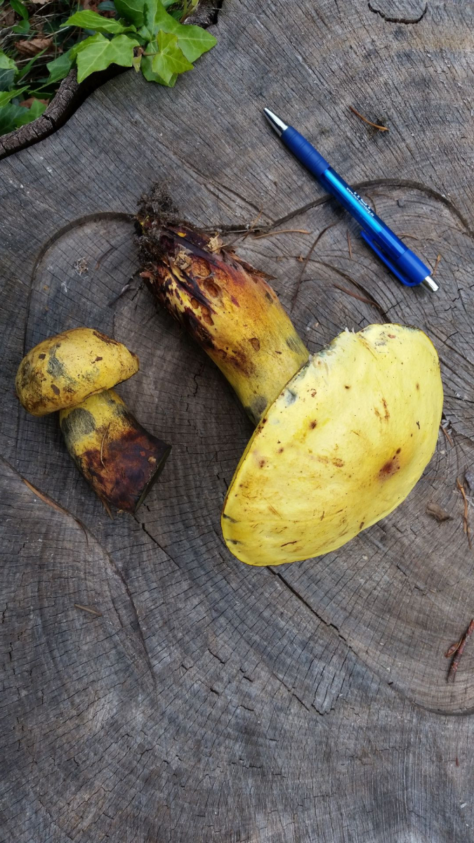 diese Pilze fand ich vor 3 Tagen im mittleren westlichen Schwarzwald auf ca 350m Höhe, Boden vermutlich eher sauer. In der Nähe Rotbuchen, eine Birke, Kiefern und in 2 bis 3 Meter Entfernung ein normaler flockenstieliger Hexenröhrling. Der kleinere der beiden Pilze war bereits von irgendjemandem abgeschnitten worden. Diese Pilze sahen aus wie flockenstielige Hexenröhrlinge ohne Rot im Hut. Bisher habe ich solche noch nie gesehen und wüsste gern wie sie heißen. Vielen Dank für eure Einschätzungen!