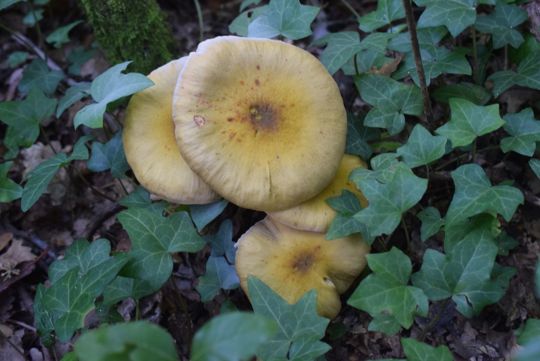 links sehe ich einen Honiggelben oder Fleischfarbenen Hallimasch (Armillaria mellea oder gallica).