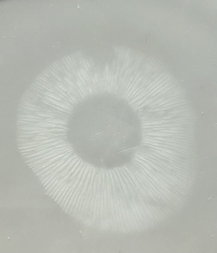 also der Sporenabwurf ist weiß. Und ein Teil der Pilze im Hexenring, nicht alle, zeigt gelbliche Verfärbungen. Ich häng noch bisserl an der Geruchsbeschreibung: mild, nicht unangenehm. Aber schaut ganz so aus, als würde der gute Werner mal wieder Recht behalten…