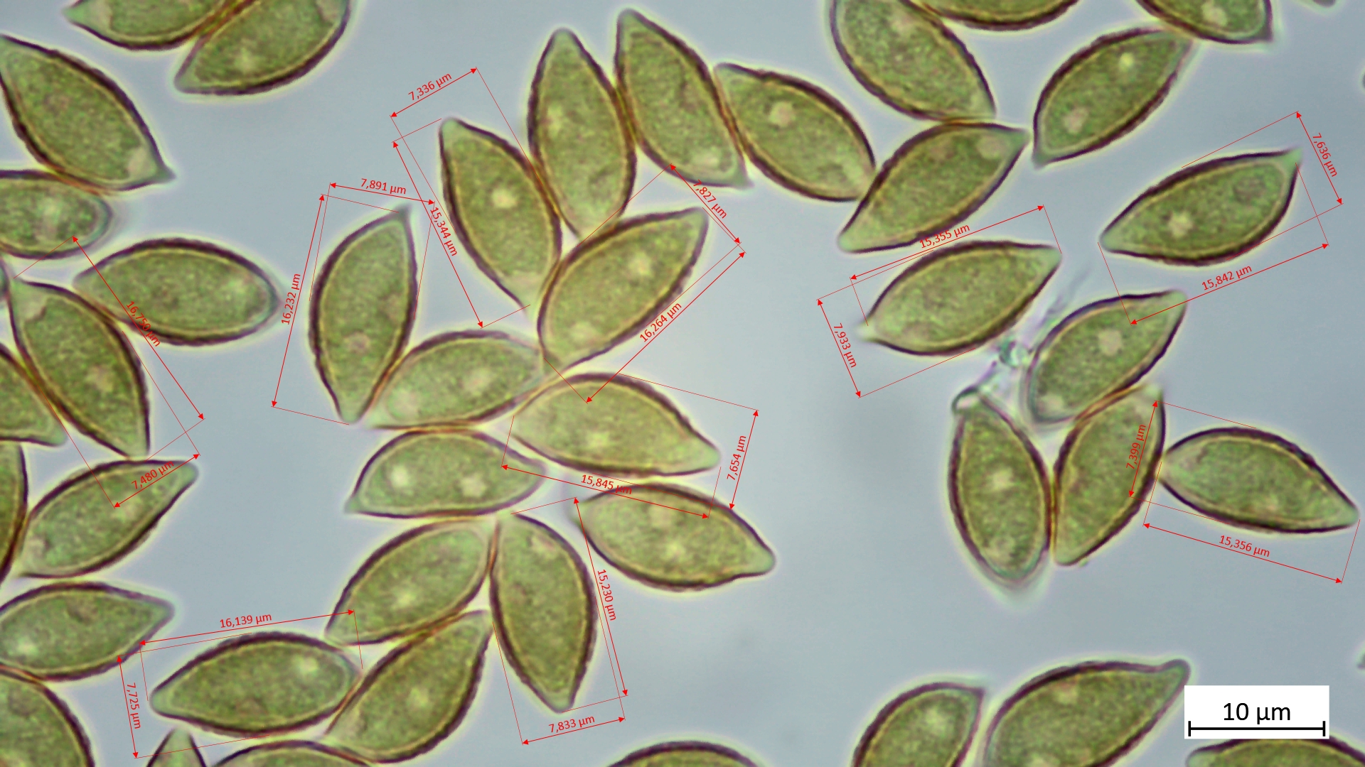 15,2-16,8 µm (av. 15,8 µm, SD 0,48 µm) x 7,3-7,9 µm (av. 7,7 µm, SD 0,2 µm); Q = 1,9-2,2 (av. 2,1, SD 0,08) (n = 10)