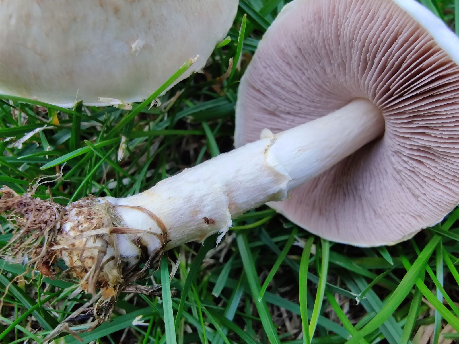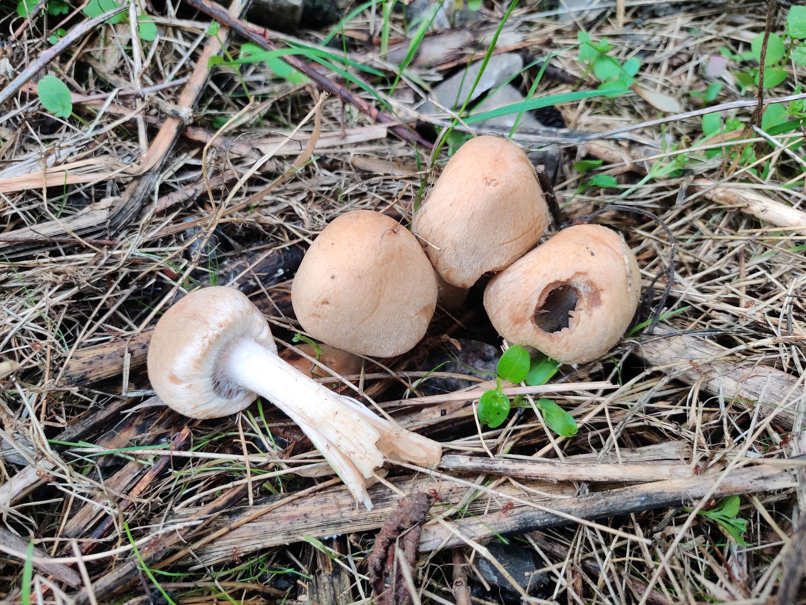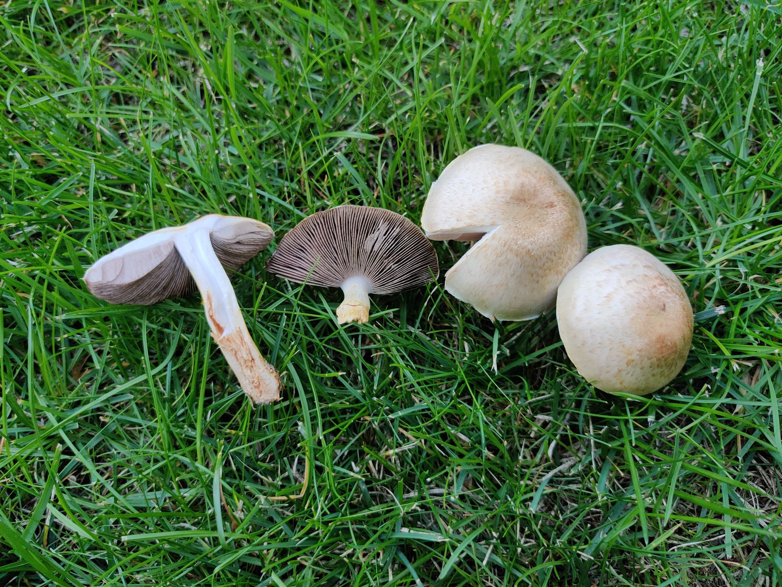4. als letztes ein Fund aus dem eigenen Garten. Die Pilze wuchsen auf dem Rasen und ich konnte ihr Wachstum über mehrere Tage beobachten. Mit dem Marzipan-Geruch, dem Gilben (vor allem an Stieloberfläche und Hutrand) sowie der geringen Größe (ausgebreiteter Hut ~ 4-5 cm) war ich schnell bei den Zwergchampignons. Am besten scheint mir hier der Agaricus dulcidulus zu passen. Ganz zufrieden bin ich damit aber nicht. Die Schüppchen auf dem Hut schienen mir eher bräunlich statt rot/wein-rot. Und generell fehlt mir bei den Champignons der Überblick, weshalb ich mich auch hier über eure Meinungen freuen würde.