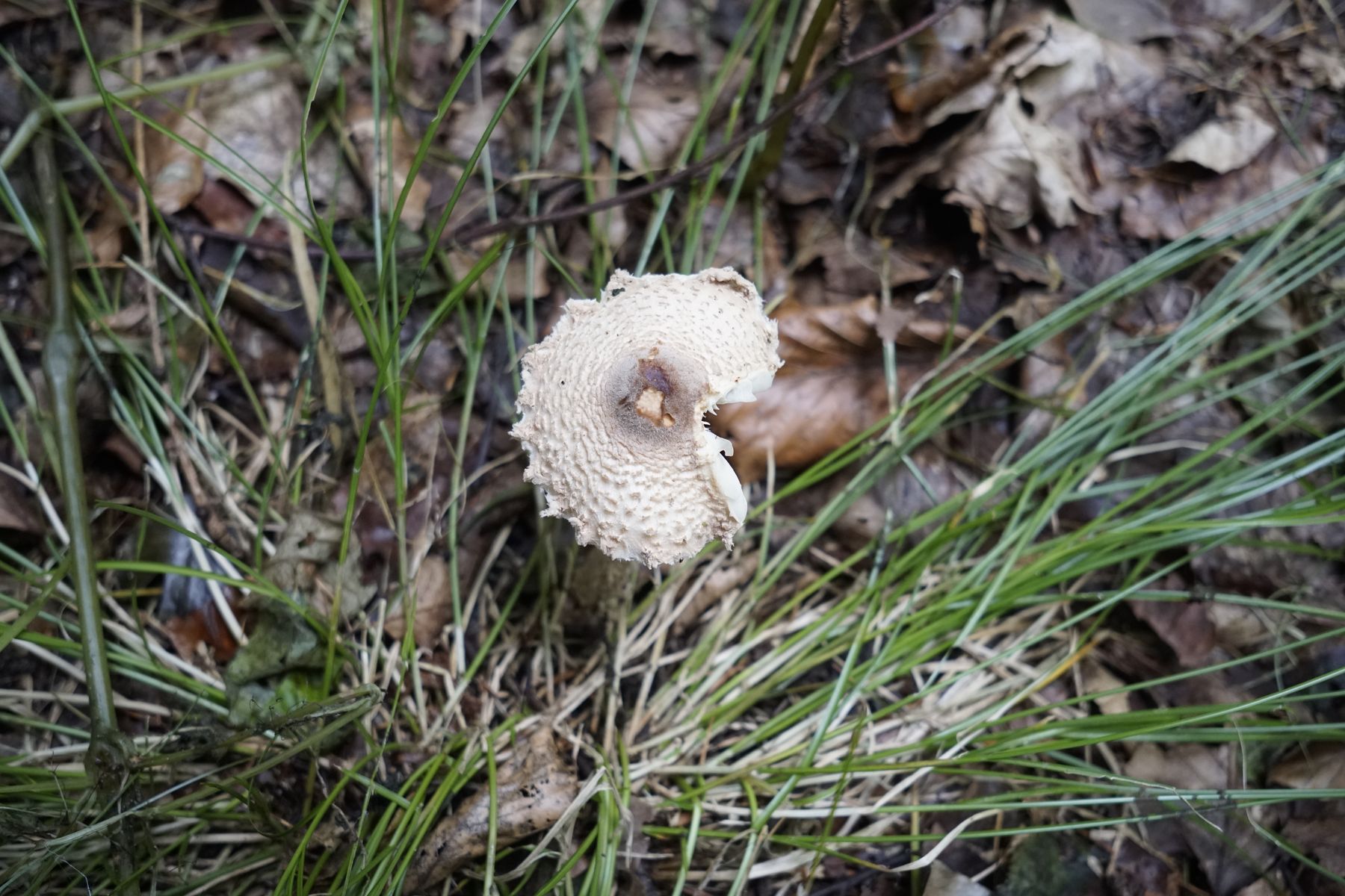 Dieser wollige Schirmling wuchs im Wald am Wegrand von Buchen u. evtl. anderen Laubbäumen (dahinter Nadelbäume, vorw. Fichte) neben dem Halbkugeligen Träuschling auf dem Boden.