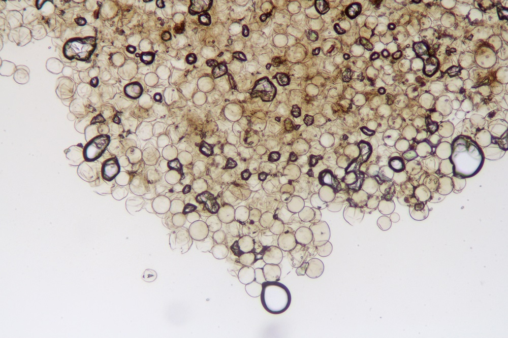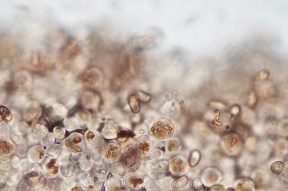 Der Hut hat eine körnig/mehlige Schicht, die unter dem Mikroskop aus kleinen runden Kügelchen besteht.