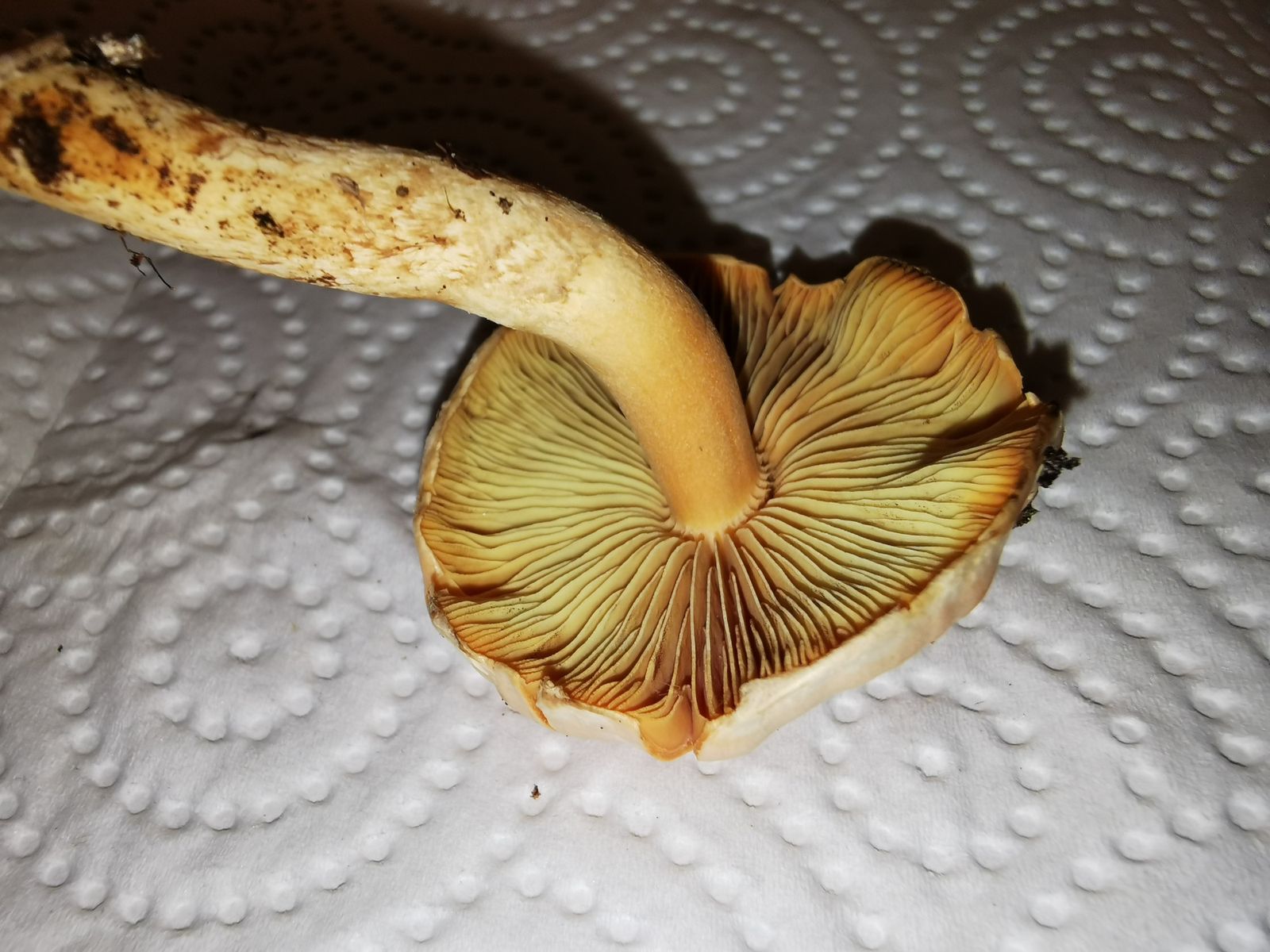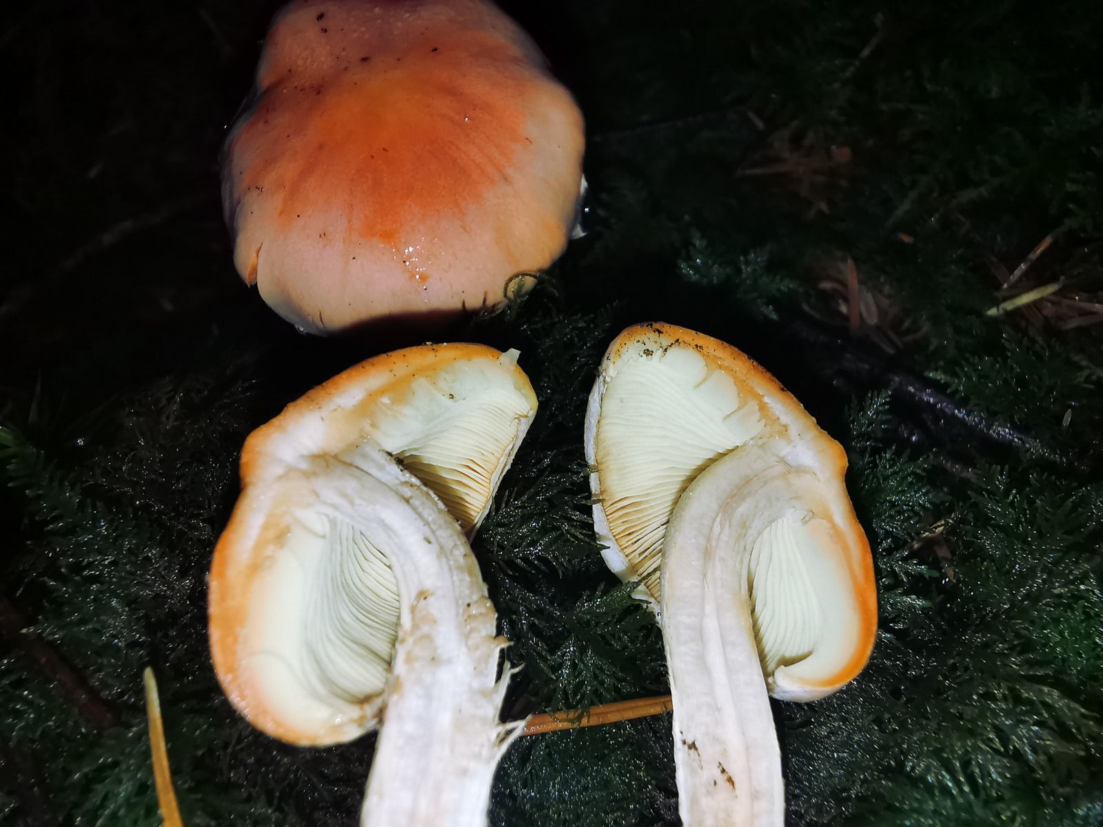 • Danke Jörg, das stimmt, die Pilze waren in der Mitte nur leicht gelblich. Leider hat es geregnet und die Fotos sind nicht so gut. Ich hatte noch mehr Fotos, habe aber zuhause gemerkt, dass diese ganz unscharf waren und leider habe ich auch kein Exemplar mitgenommen.