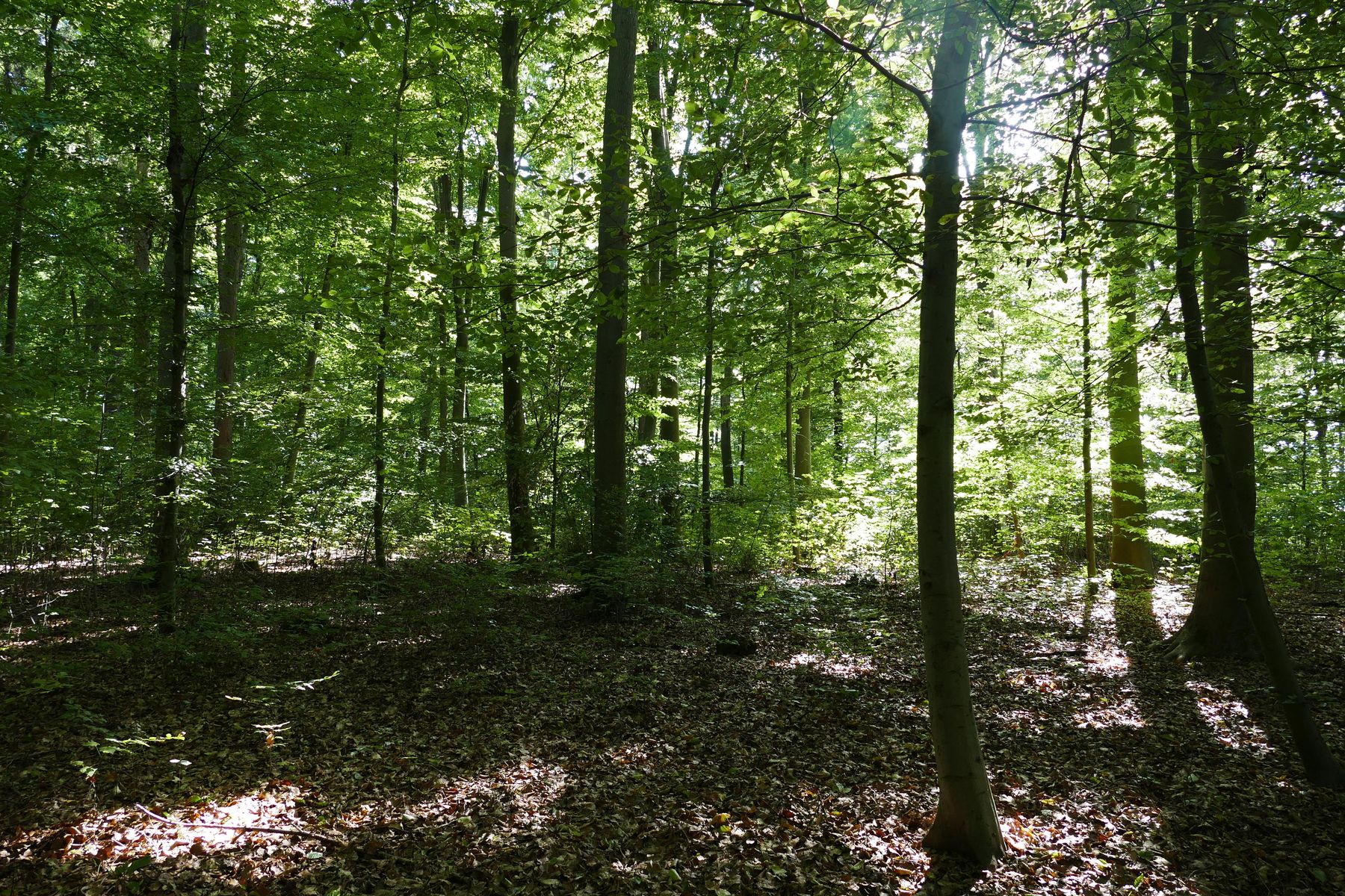 Die beiden Waldstücke, in denen ich unterwegs war, bestehen aus Laubwald mit hohem Rotbucheanteil, mit Eichen, Ahorn, Eschen, Kirsche etc., mit stellenweise eingestreuten Nadelhainen aus Fichten, Kiefern und Douglasien.