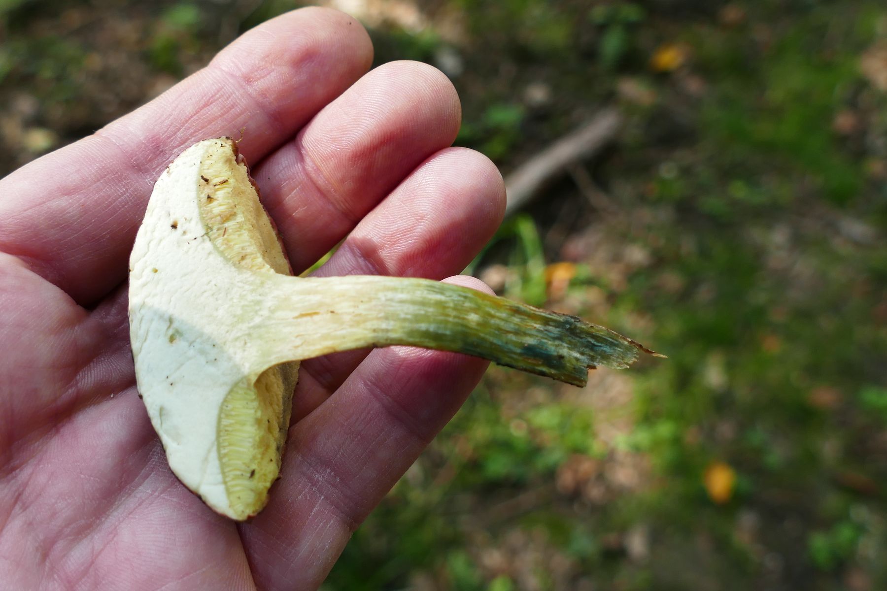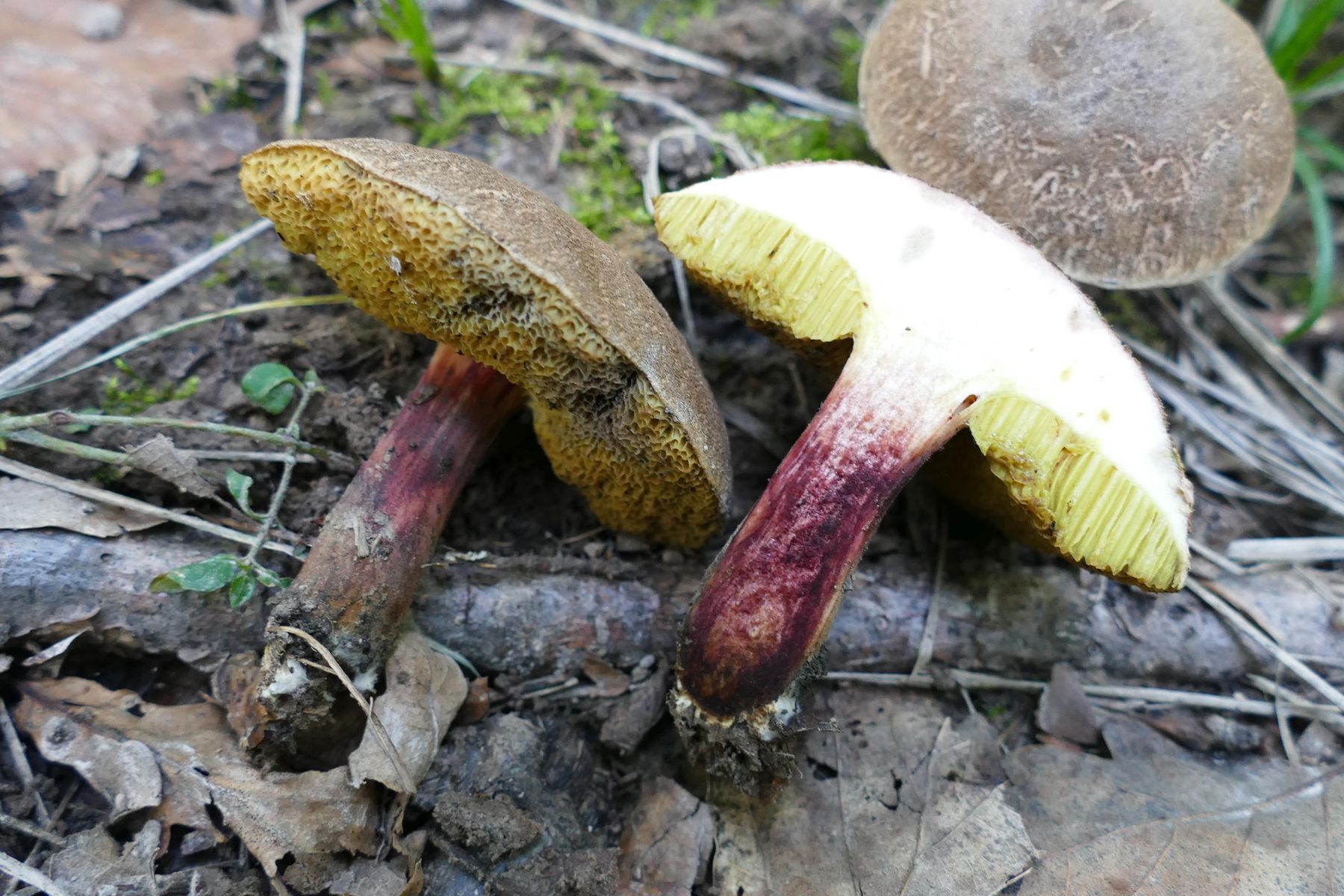 Die eine Sorte zeigt rotes Stielfleisch und blaut nicht, weder im Querschnitt, noch an den gedrückten, groben Röhren.
