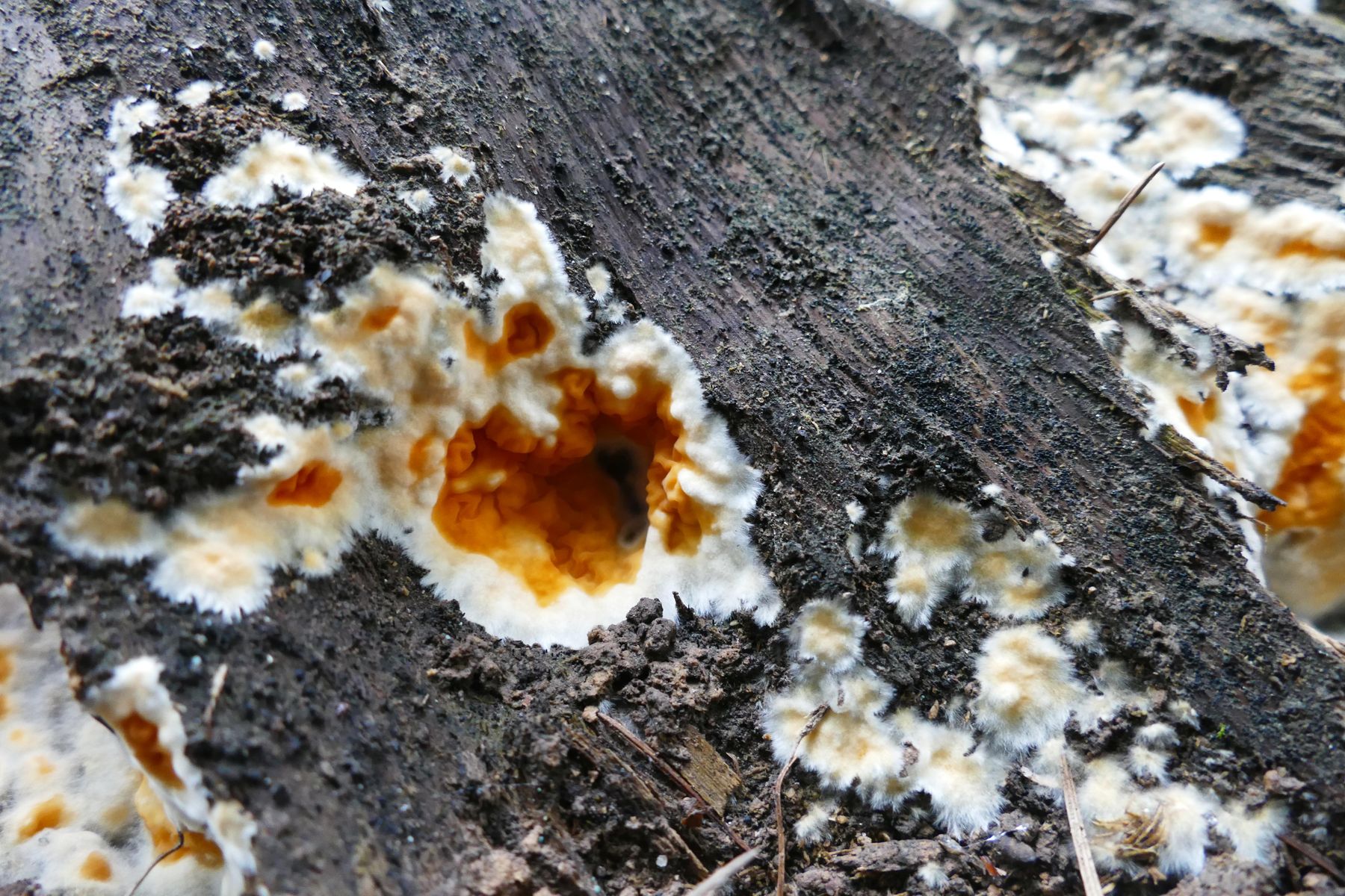 Ein sehr farbenfreudiger, merullioder Pilz in Höhlungen eines Kiefernstumpfes fällt mir schon von weitem auf.