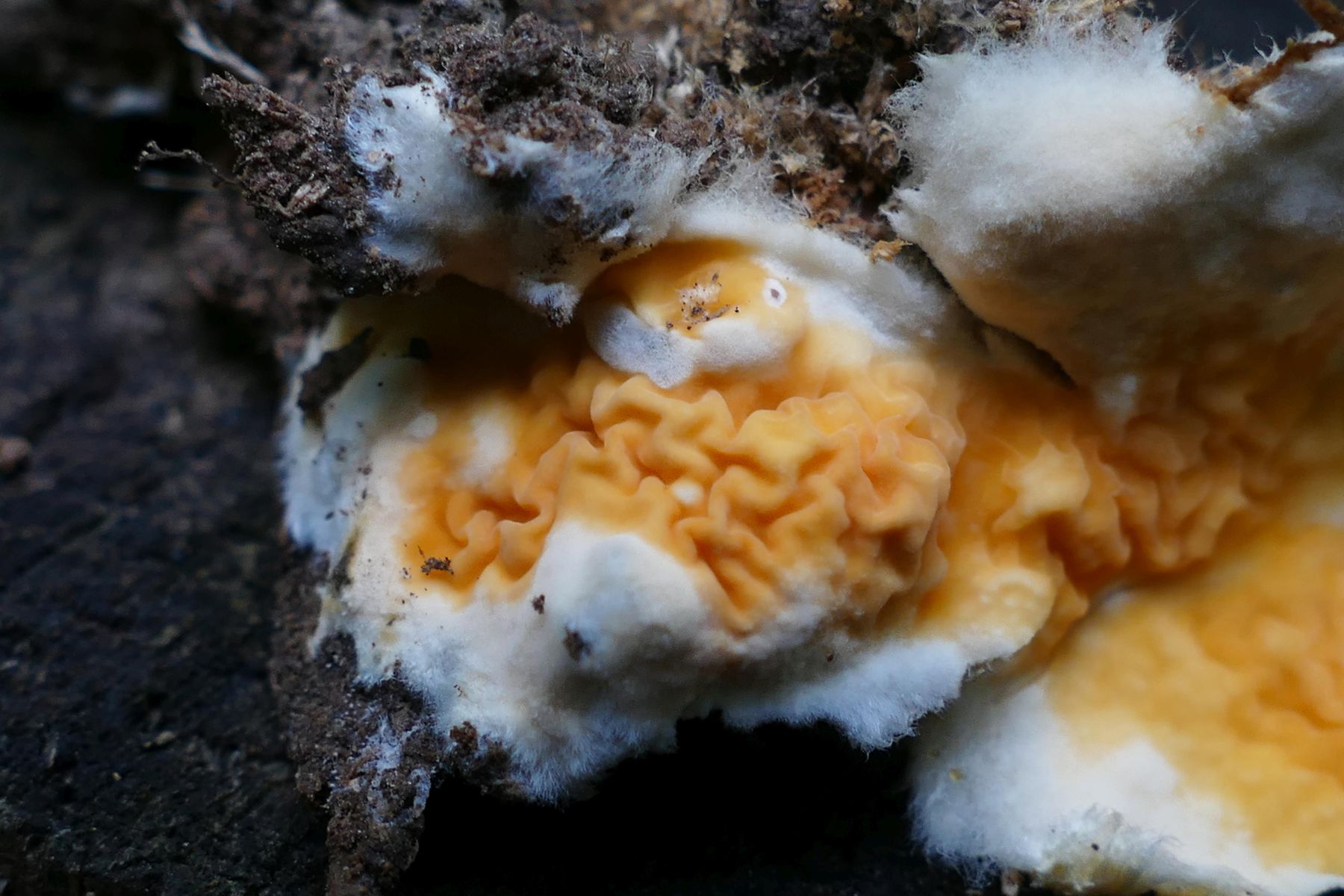 Das könnte gut Leucogyrophana mollusca, der Orangene Kiefernfältling sein, auf jeden Fall auch ein Erstfund für mich. ![]()