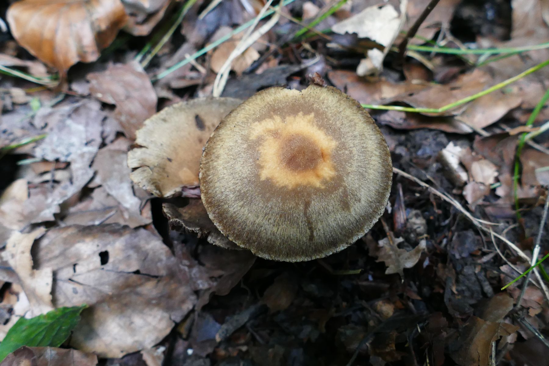 Ein hygrophaner, dunkelbrauner Pilz mit orangenem Zentrum in der Hutmitte eines sehr fasrigen Hutes, Velumreste am Hutrand.