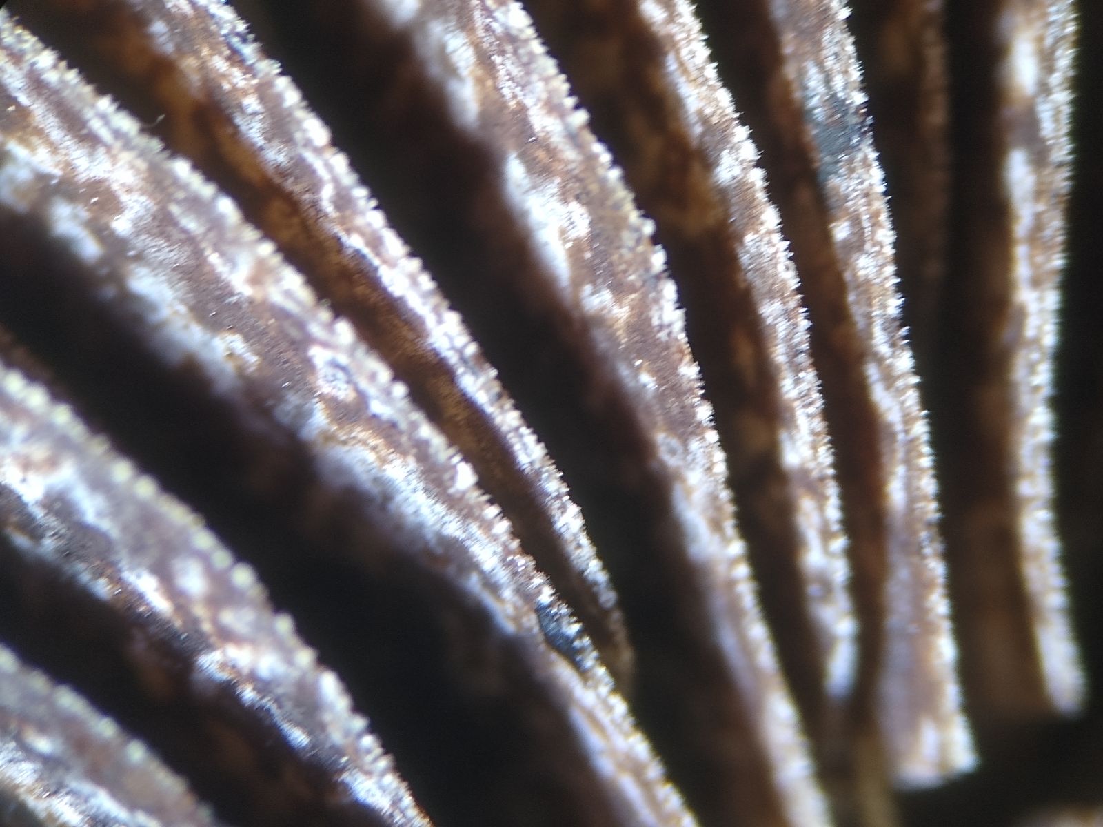 Dunkle, marmorierte Lamellen; im Kontrast dazu helle Lamellenschneiden.