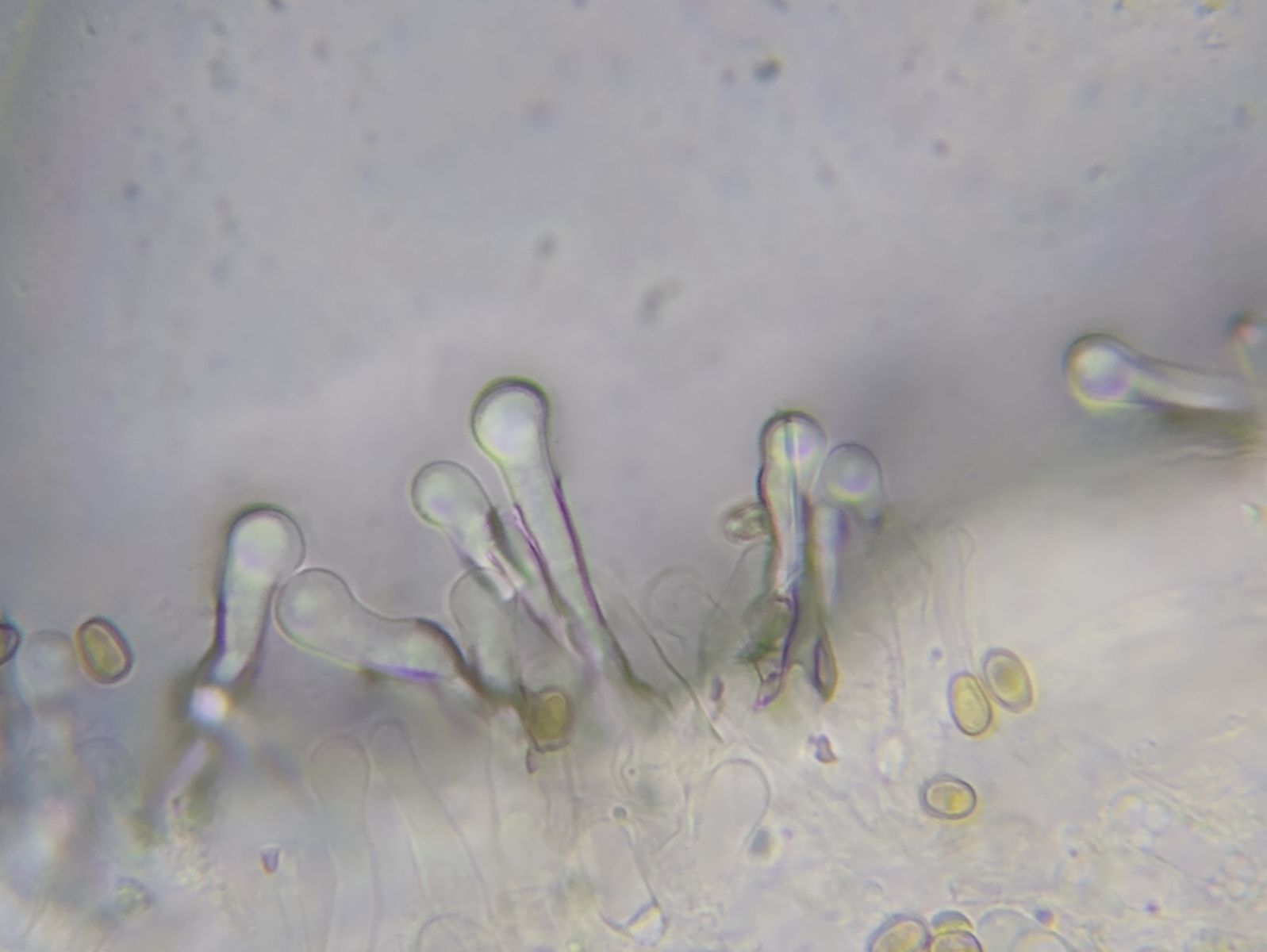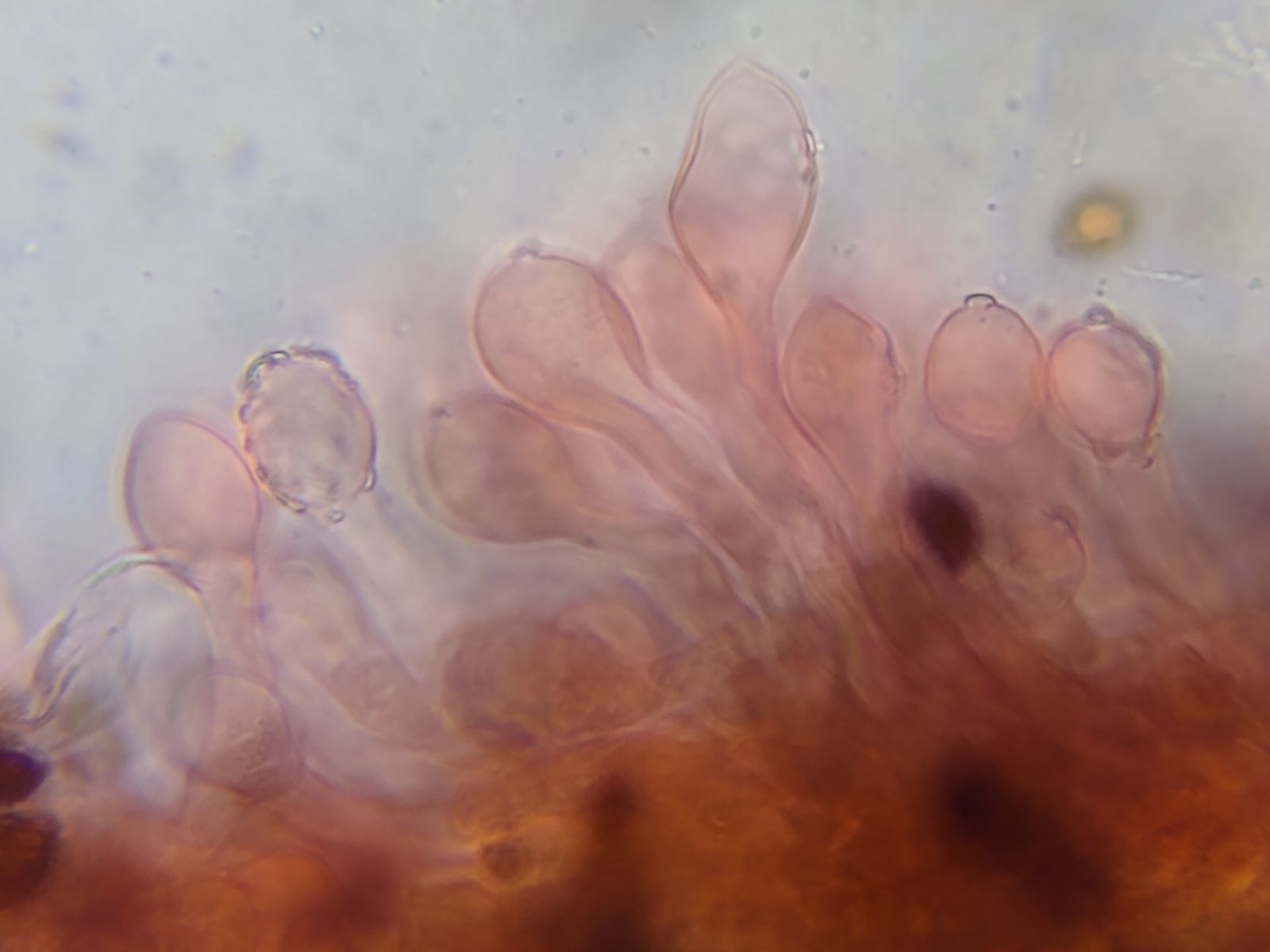 Cheilozystiden kopfig, Stiel von Basis sich keulig verbreiternd bis Köpfchen.