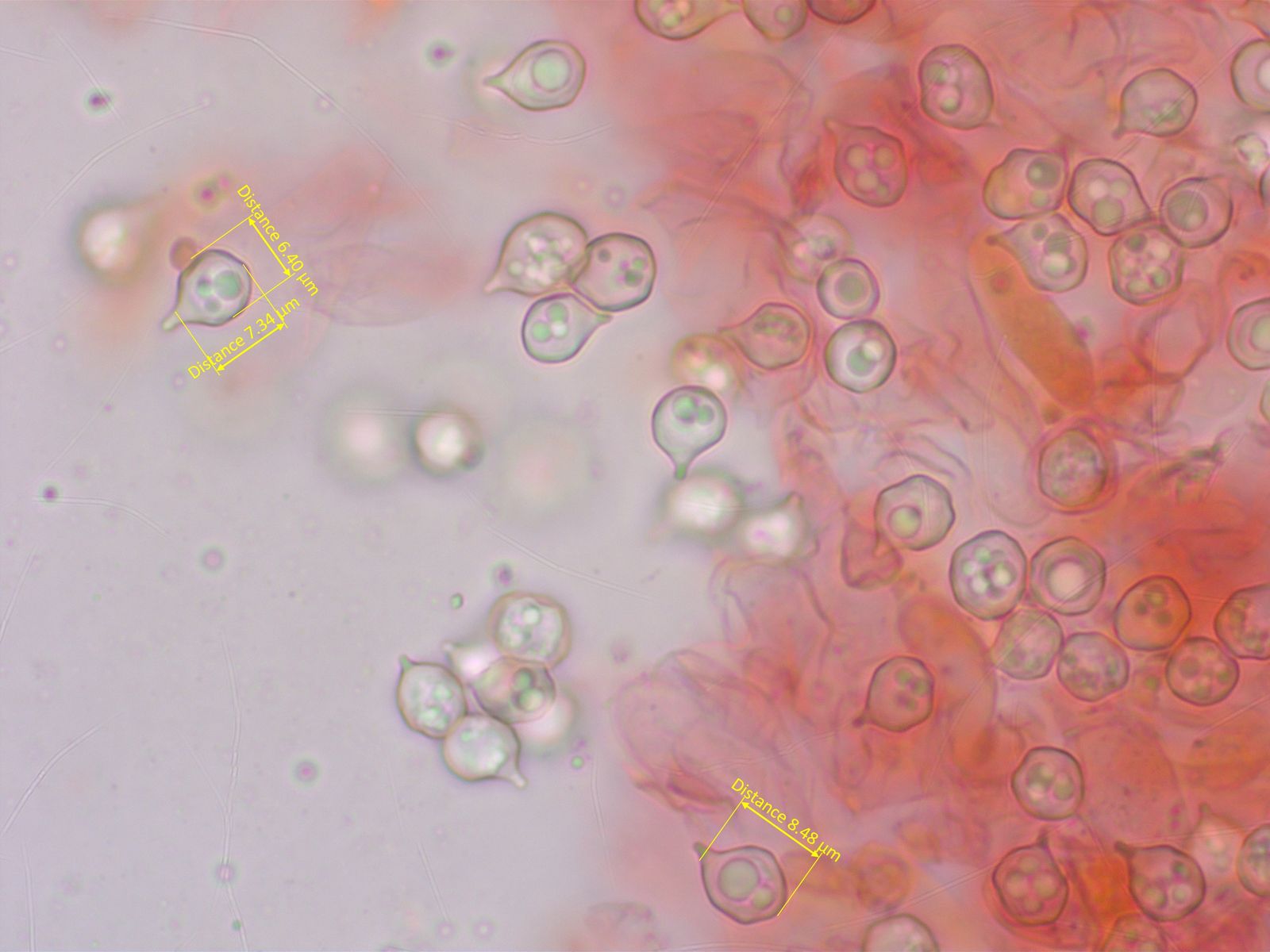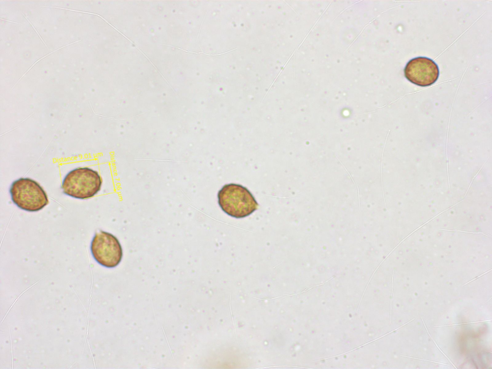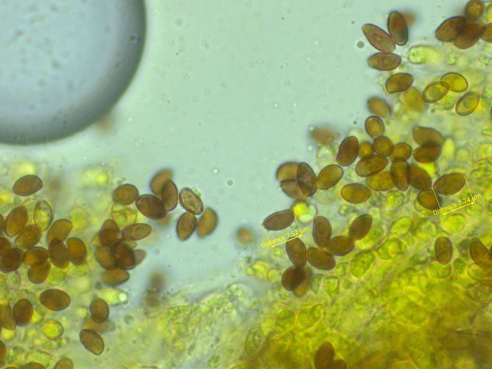 Sporen breitelliptisch bis rundlich und recht klein, bis 9.5 µm lang.