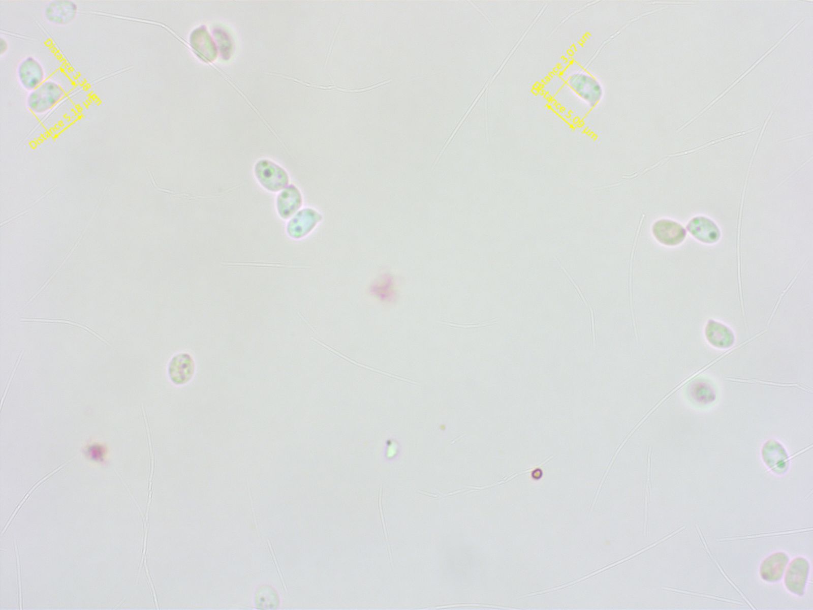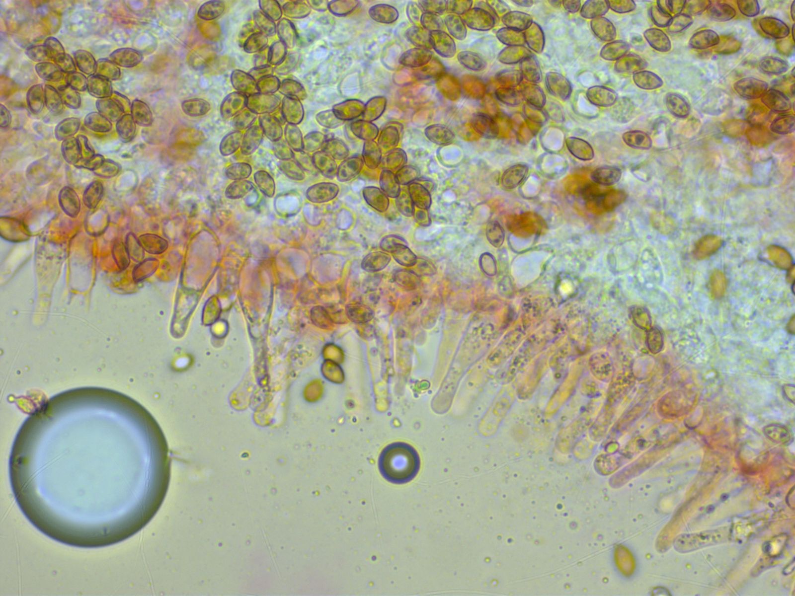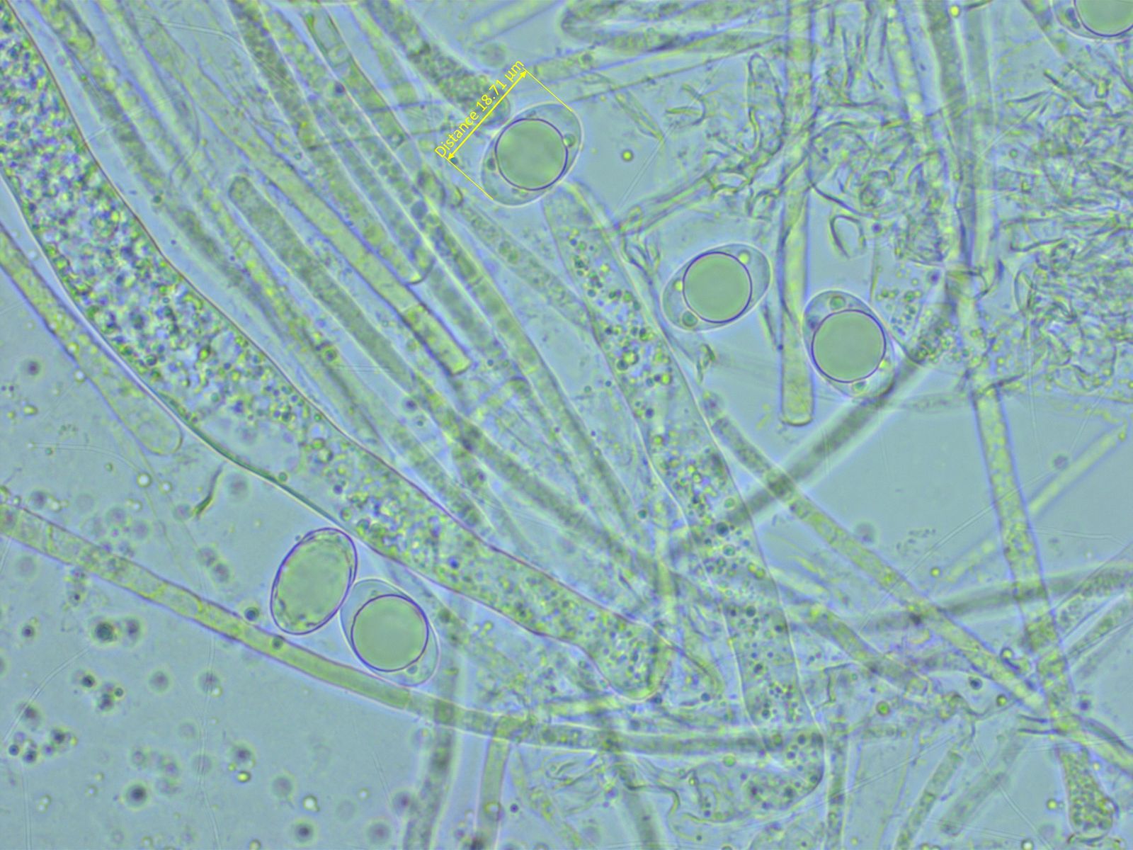 Sporen breitelliptisch bis rundlich und recht klein, bis 9.5 µm lang.