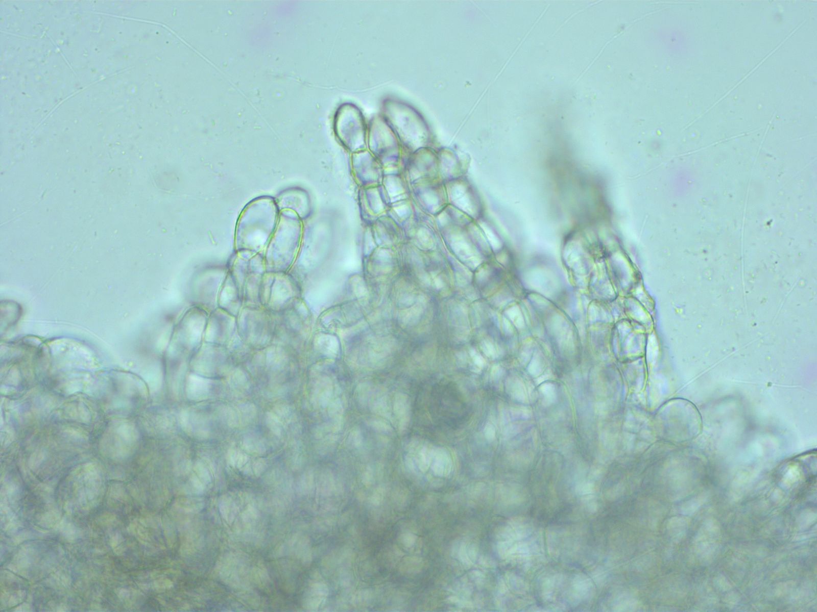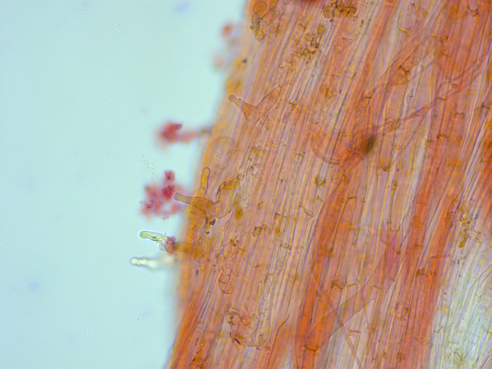 Die Haare an der Aussenseite bestehen aus langen Ketten von rundlichen oder elliptischen Zellen.