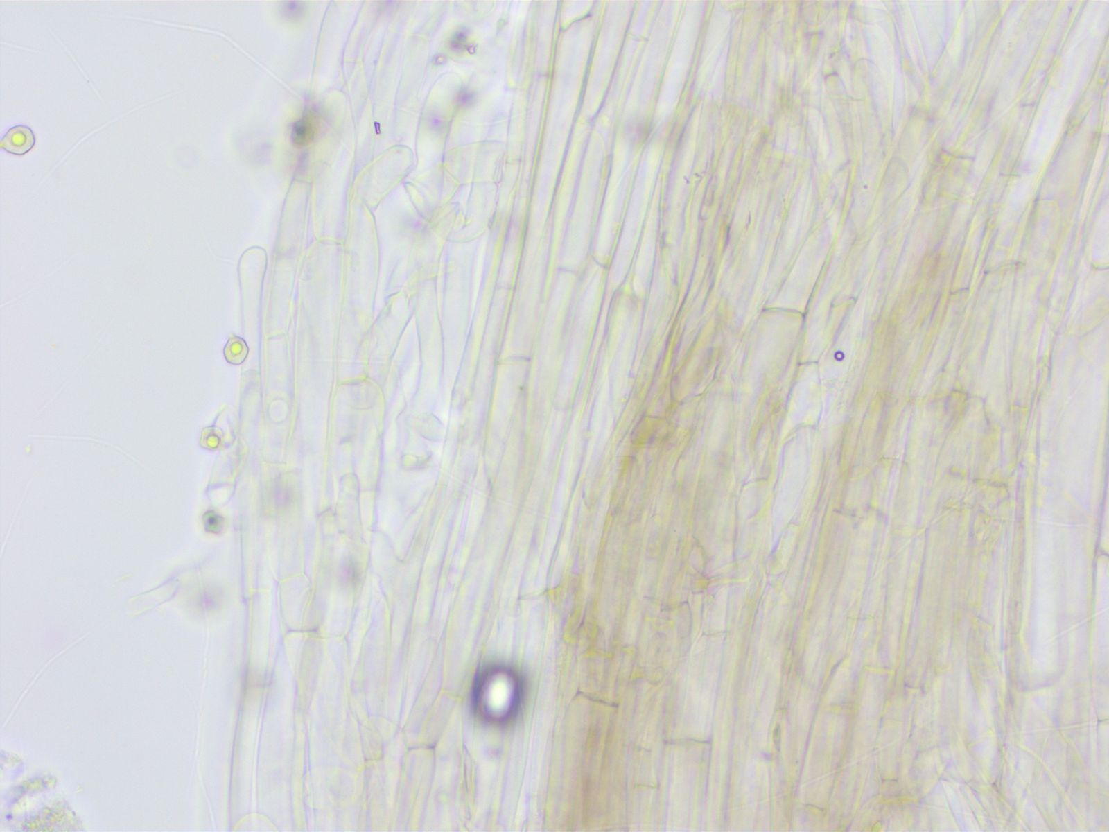 Stipitipellis wenig auffällig, es gab aber einzelne keulige Hyphenenden, die man als Kaulozystiden bezeichnen könnte.