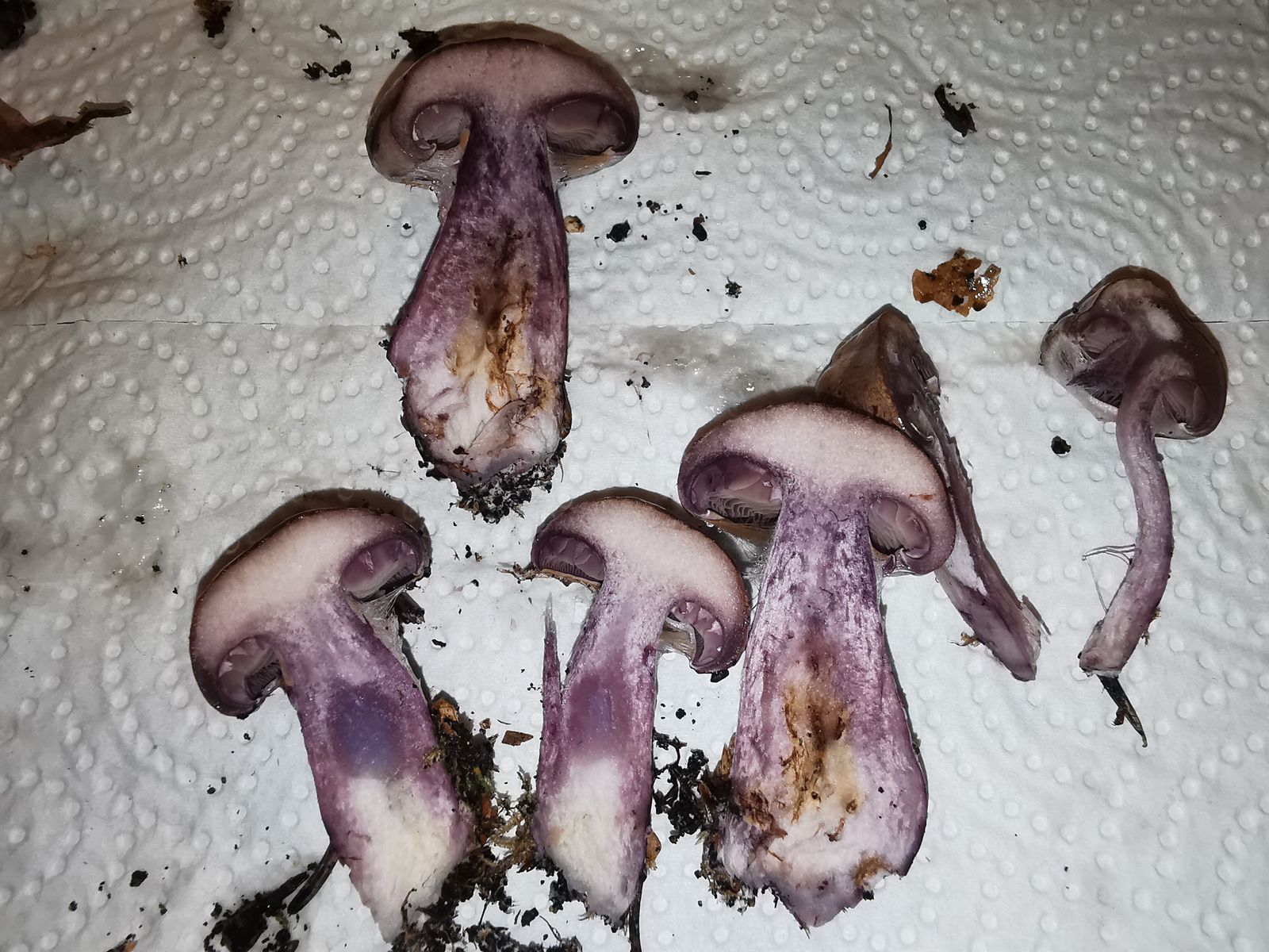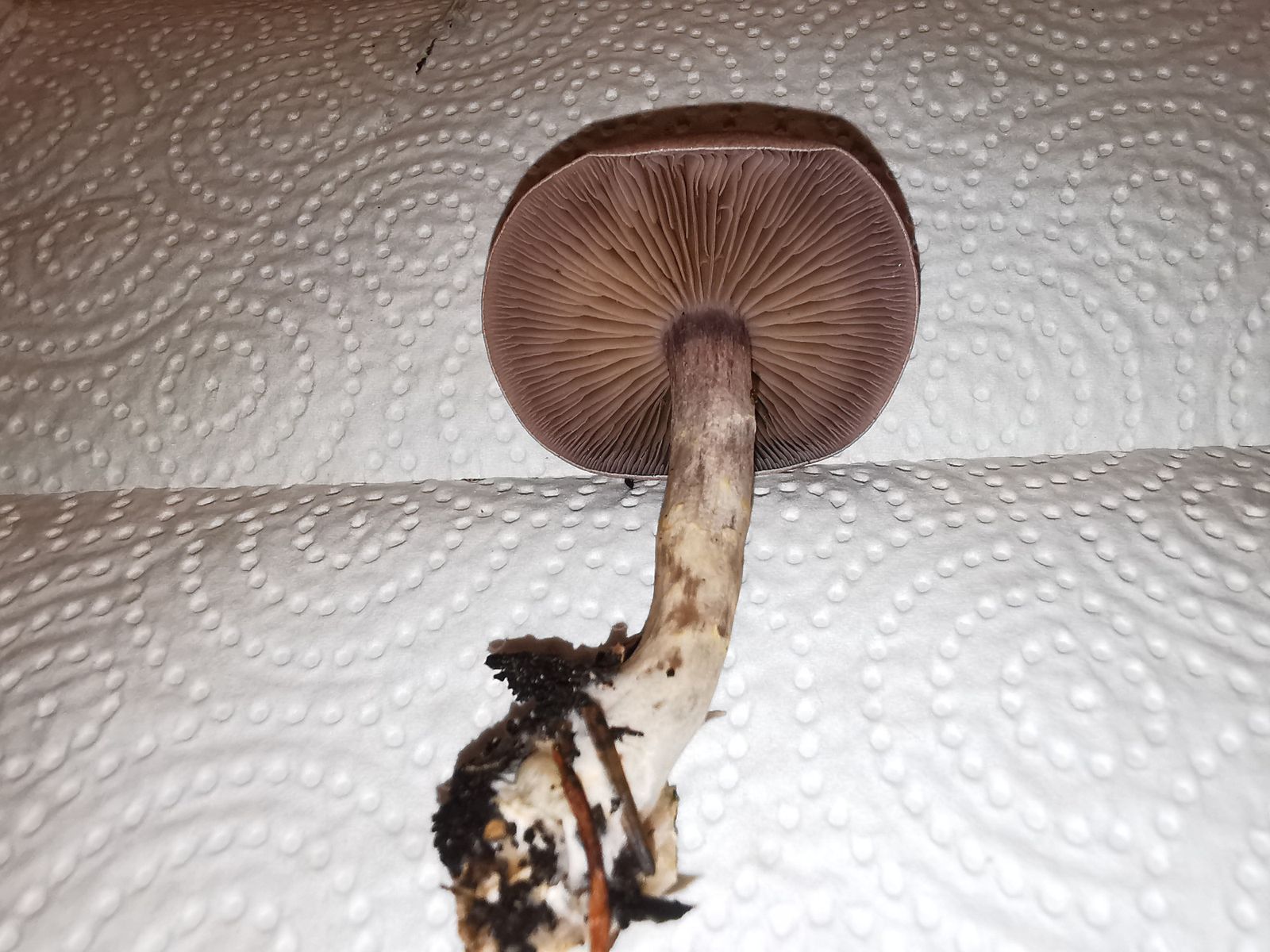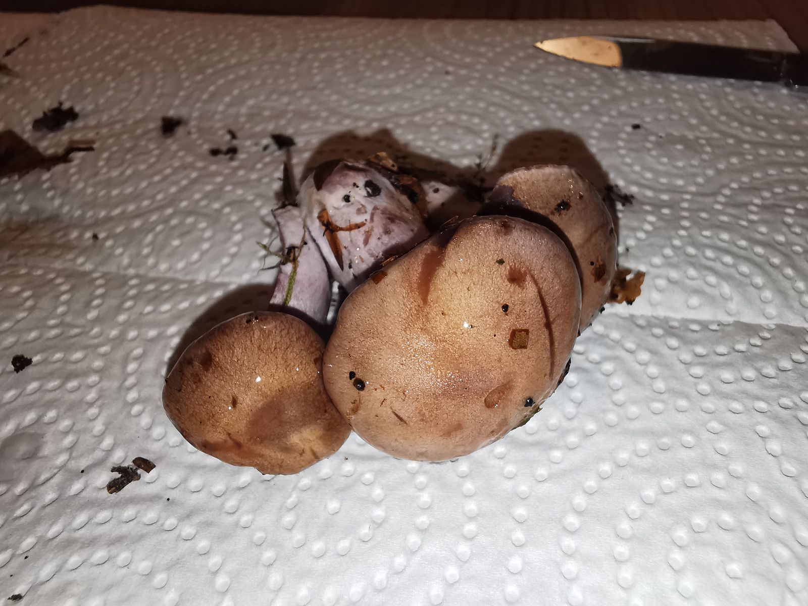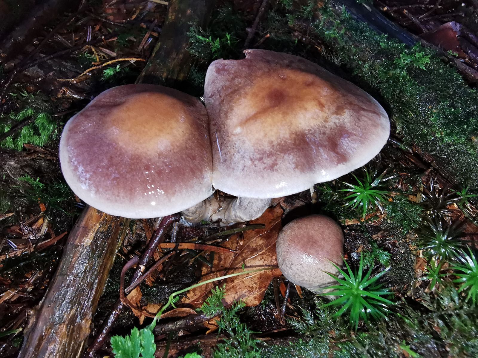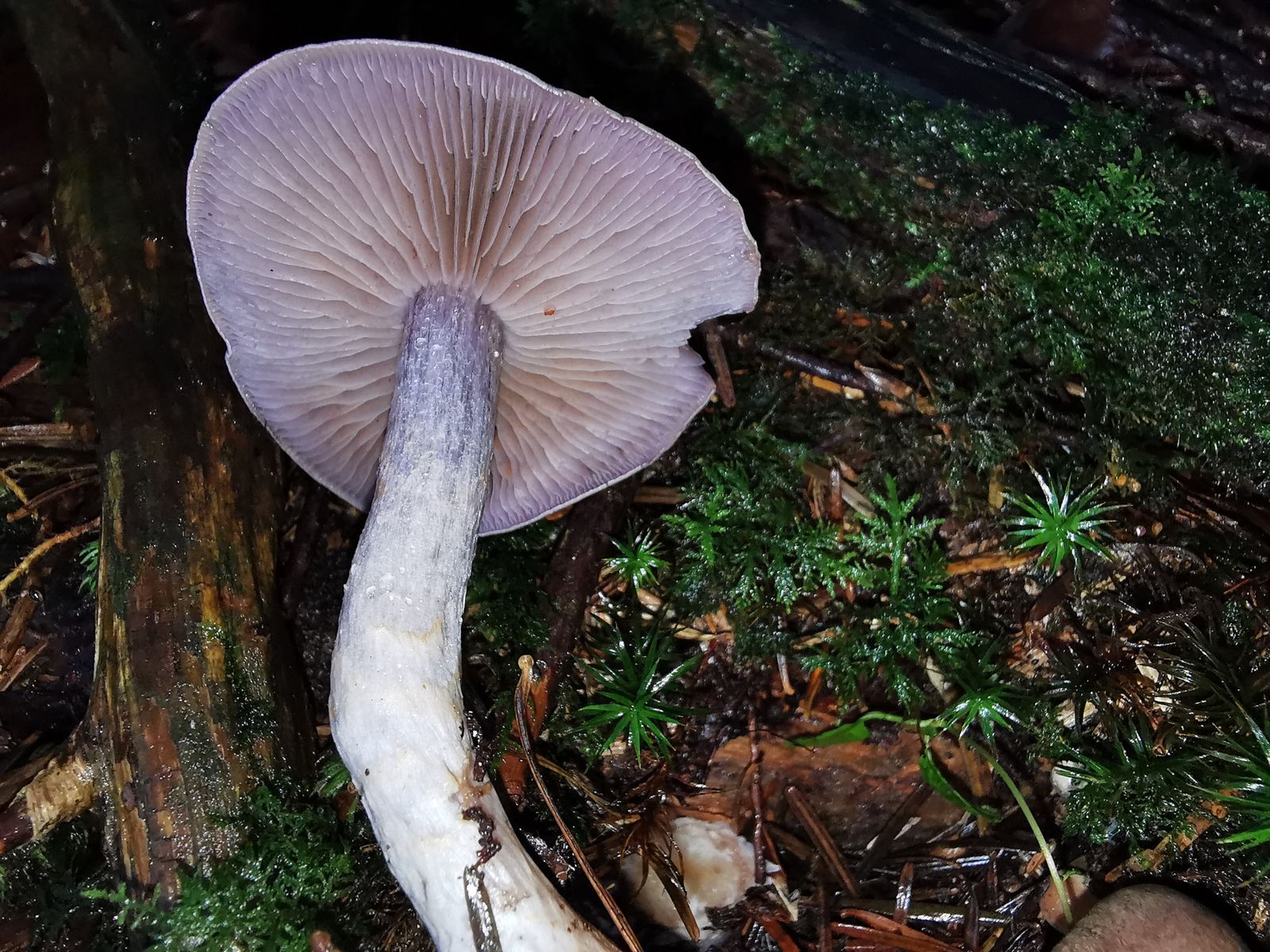 Der erste Pilz stand in der Nähe einer Tanne und einer Fichte. Der Hut war deutlich hygrophan, bräunlich mit einem leichten violetten Stich. Geruch leicht rettichartig. Meine Vermutung ist der Rettichgürtelfuss - Cortinarius evernius.