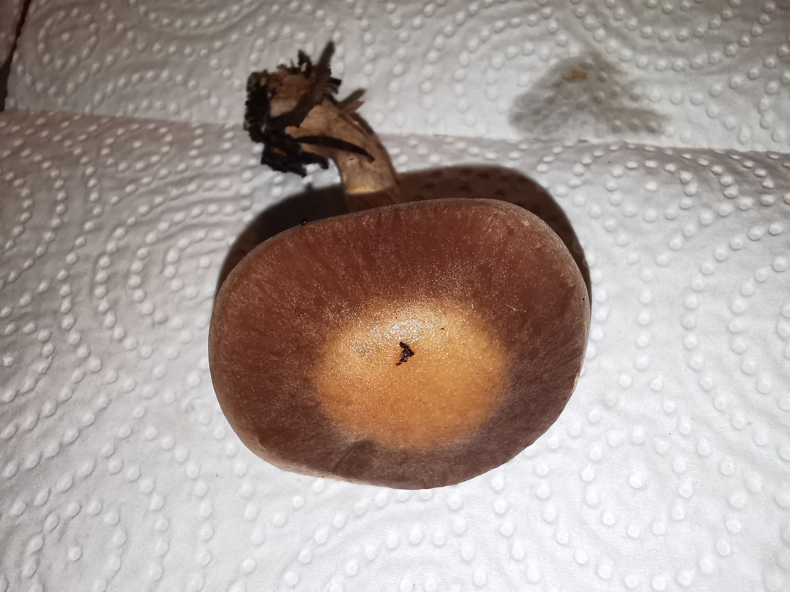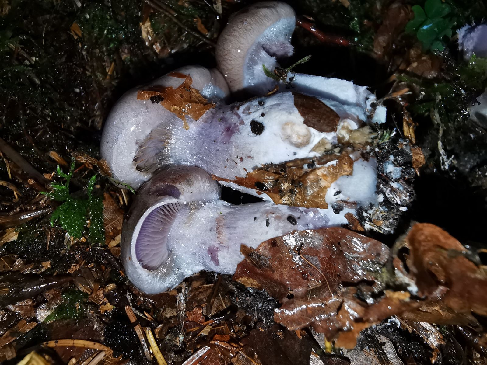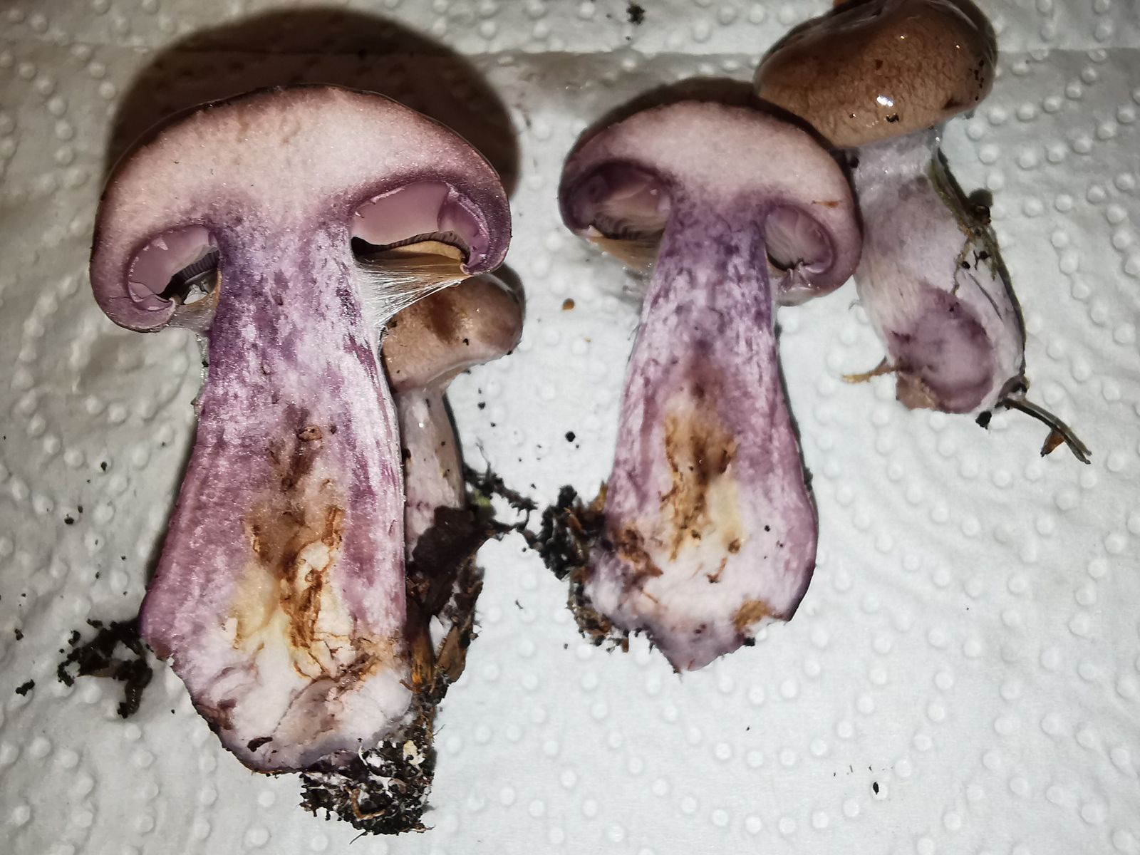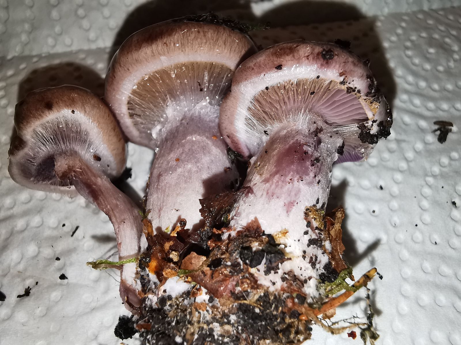 Der erste Pilz stand in der Nähe einer Tanne und einer Fichte. Der Hut war deutlich hygrophan, bräunlich mit einem leichten violetten Stich. Geruch leicht rettichartig. Meine Vermutung ist der Rettichgürtelfuss - Cortinarius evernius.
