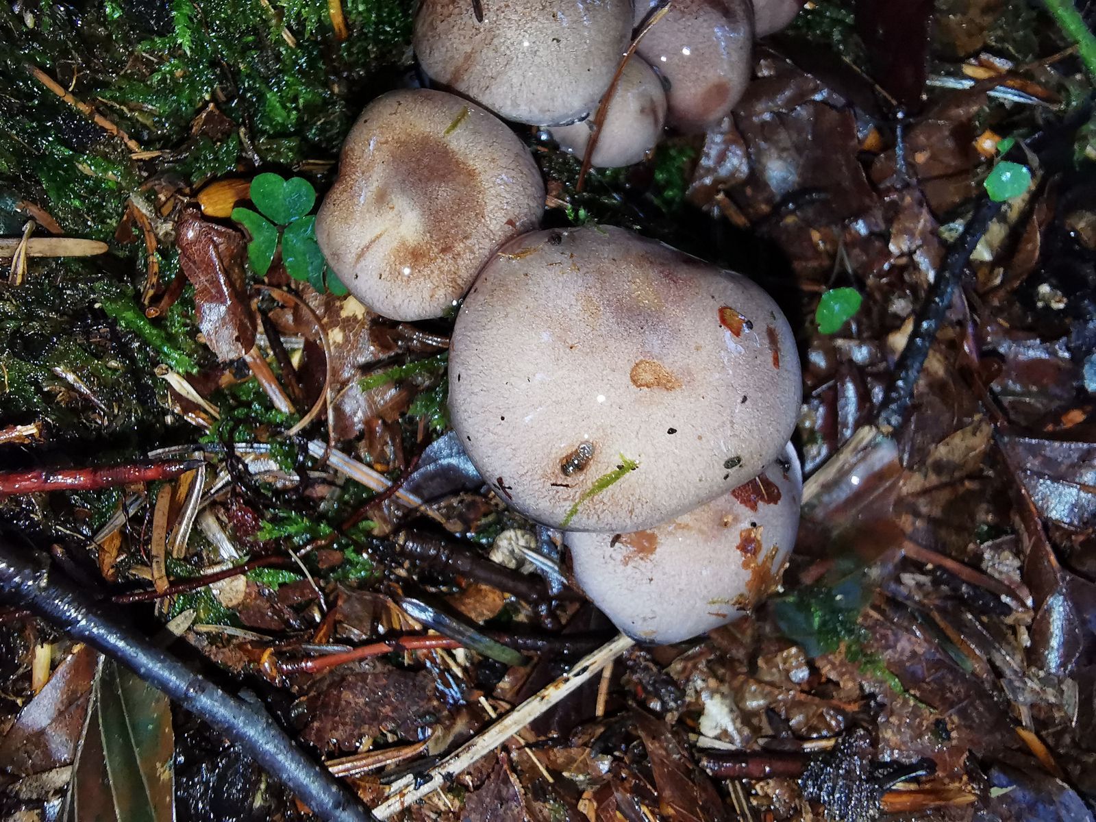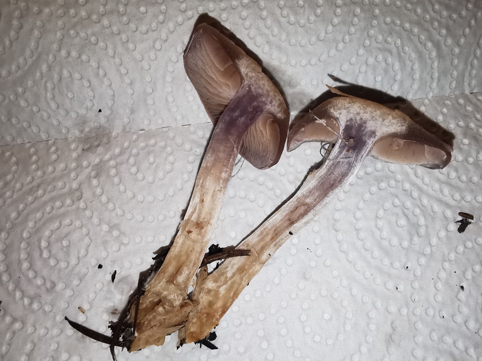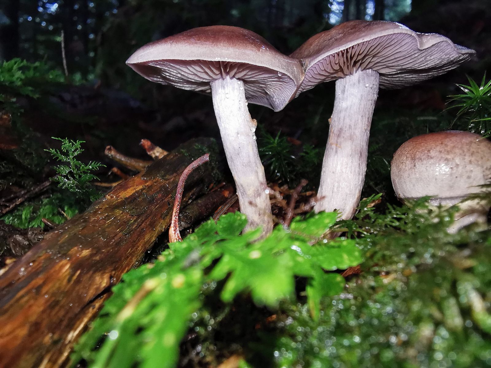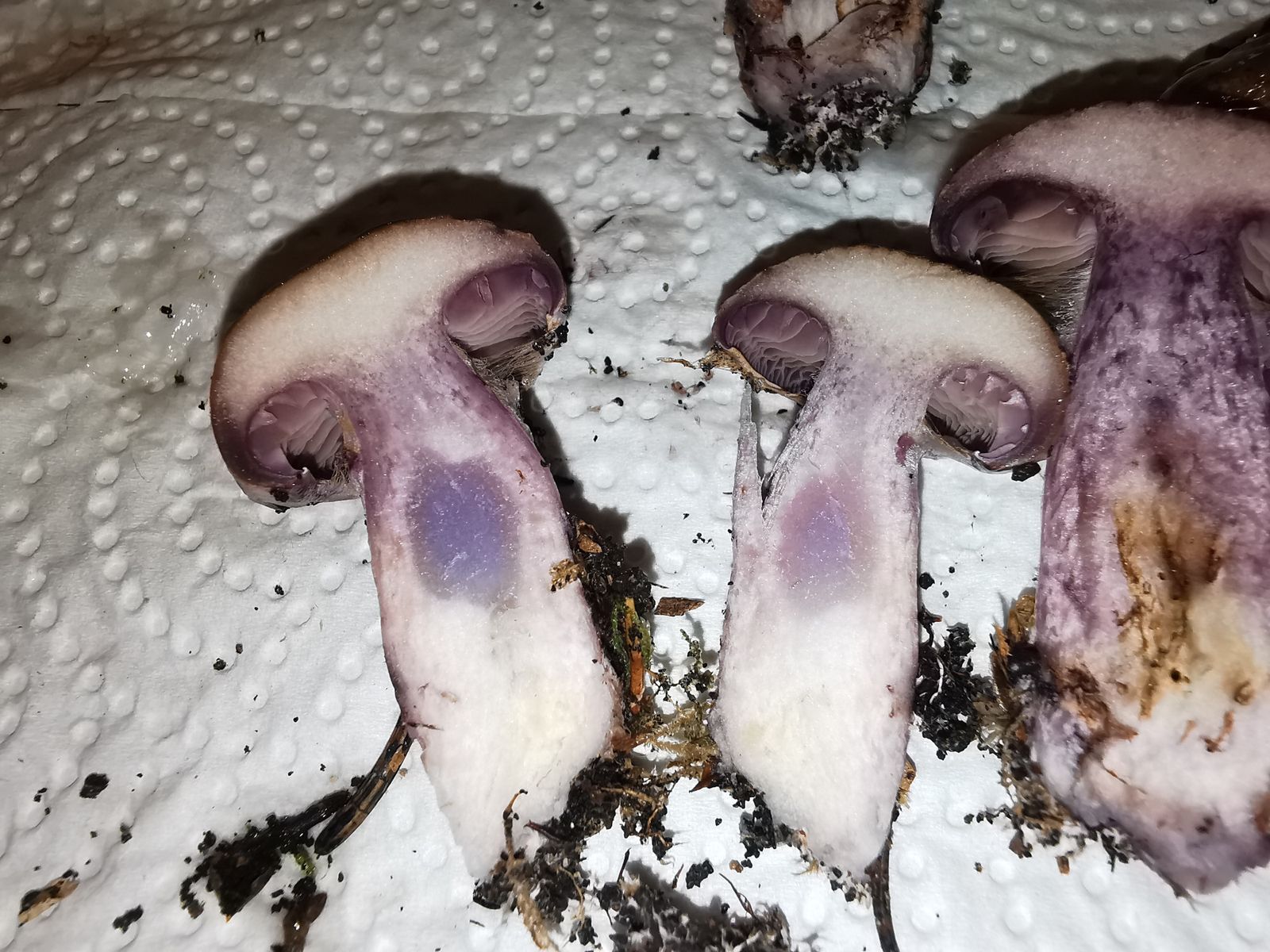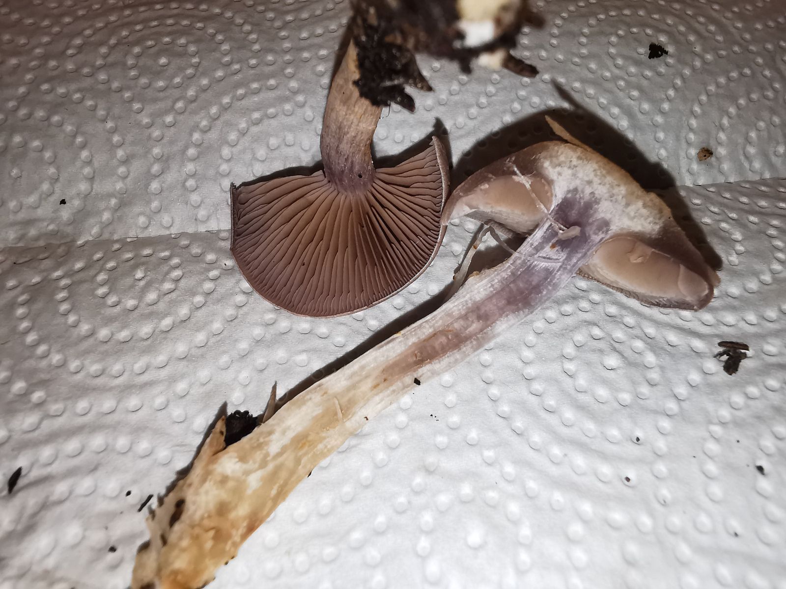 Der erste Pilz stand in der Nähe einer Tanne und einer Fichte. Der Hut war deutlich hygrophan, bräunlich mit einem leichten violetten Stich. Geruch leicht rettichartig. Meine Vermutung ist der Rettichgürtelfuss - Cortinarius evernius.