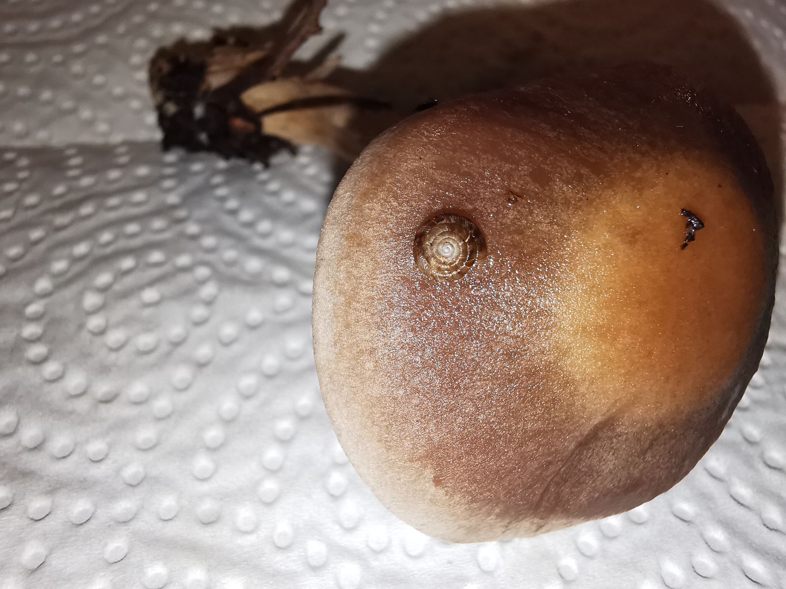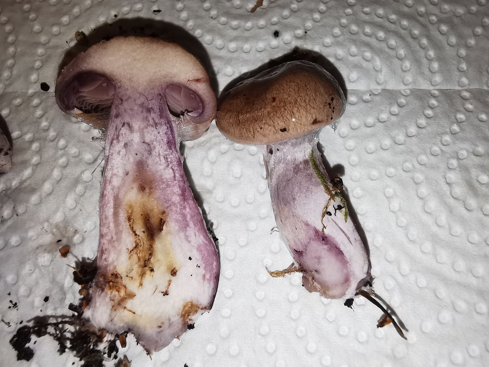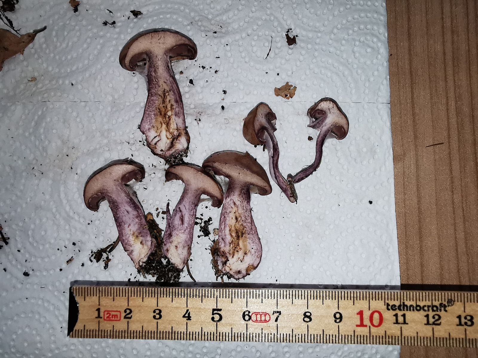 Schleimiger, graubräunlicher und faseriger Hut. Geruch leicht nach Honig. Fleisch weisslich-violett, nach einer Weile deutlich violett verfärbend. Eigentlich passen die Merkmale sehr gut zum Purpurfüssigen Schleimkopf - Cortinarius porphyropus. Mal sehen, ob ihr damit einverstanden seid.