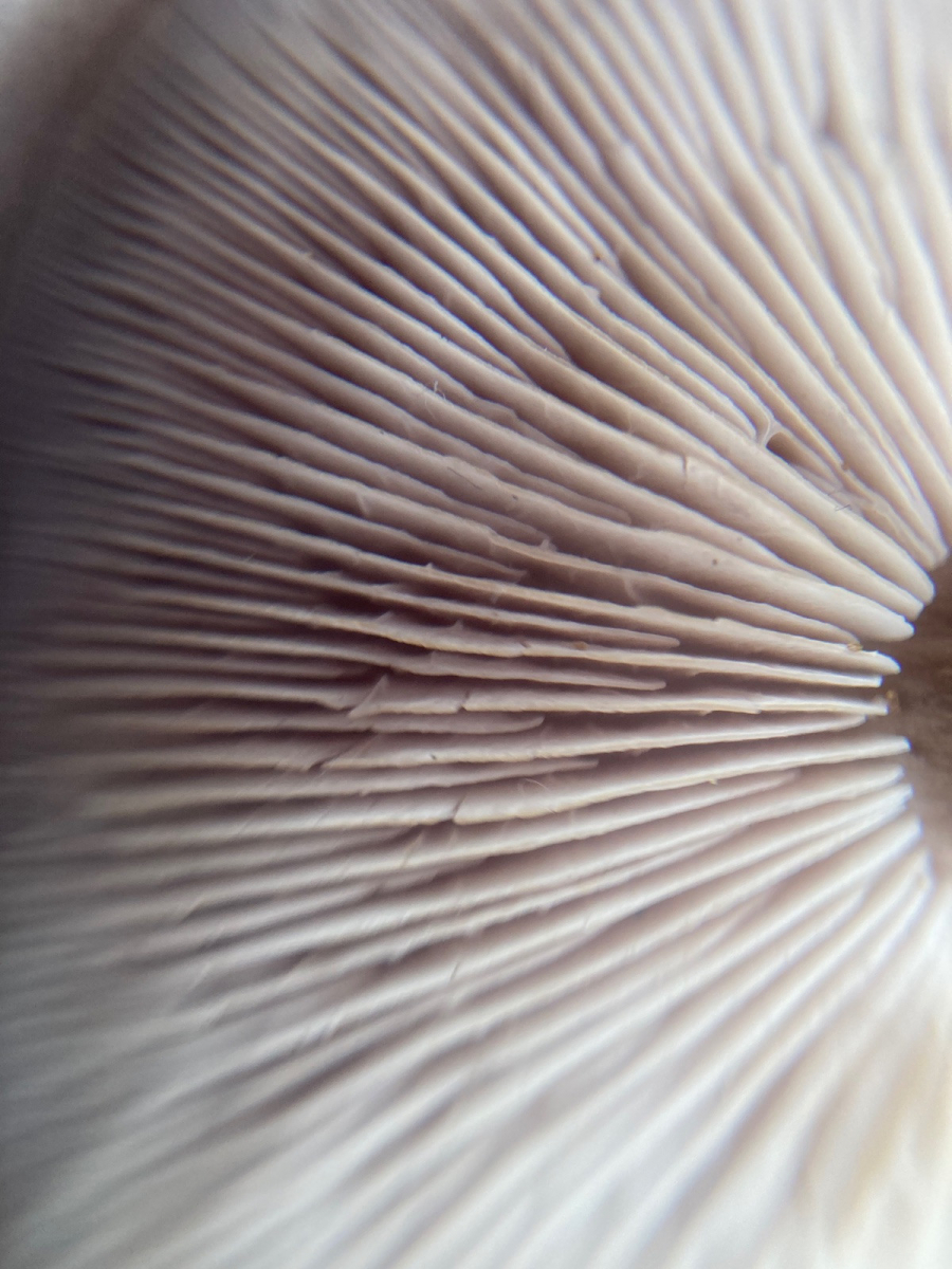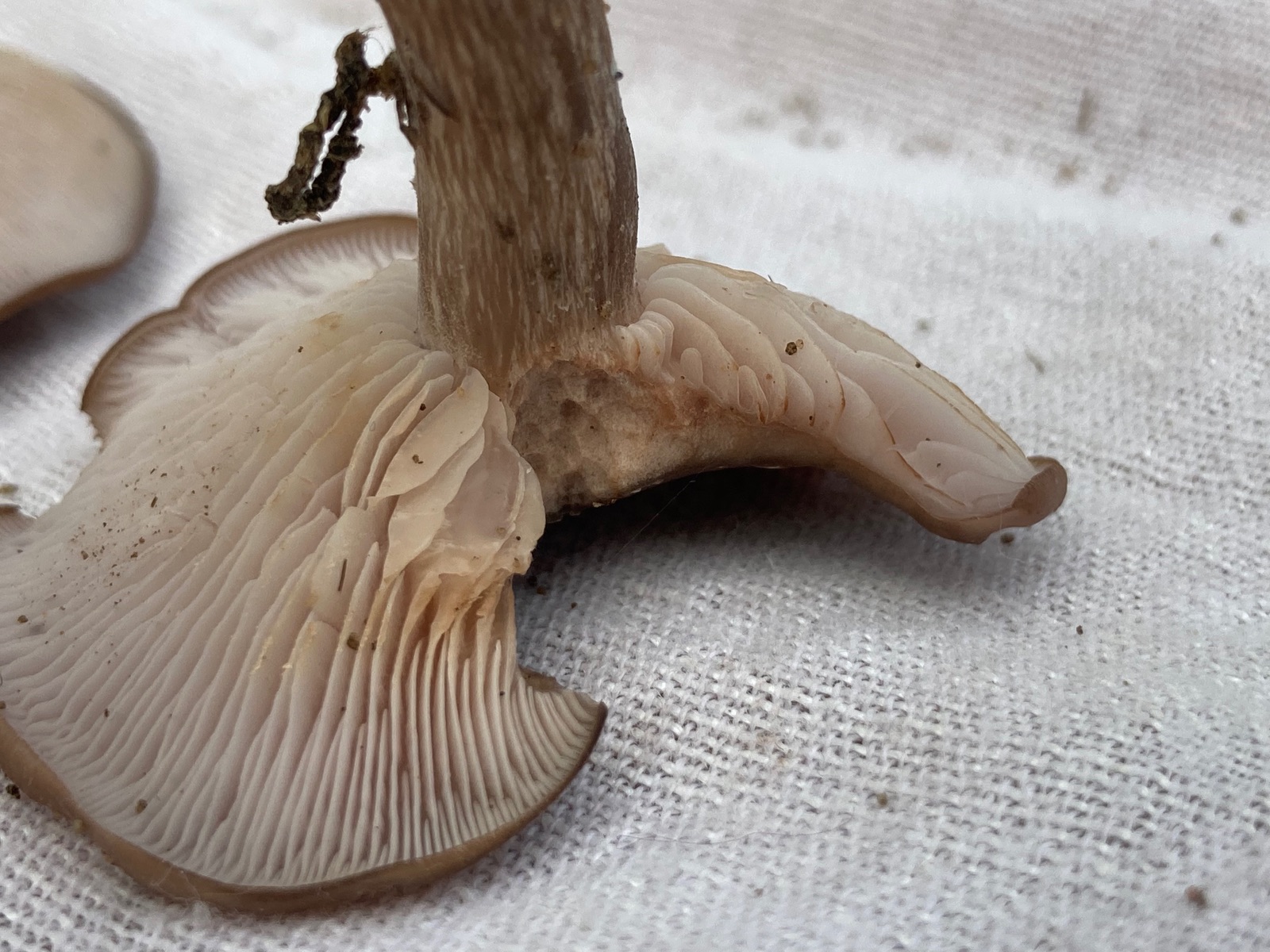 Lamellen: Gräulich, fleischfarben, mit Lamelleten und ganz kurzen Queradern, aber nicht verbunden (Siehe Foto). Mit der Beschreibung von Lamellen die nicht herablaufend und nicht frei sind tu ich mich oft schwer: ich würde sagen angeheftet?