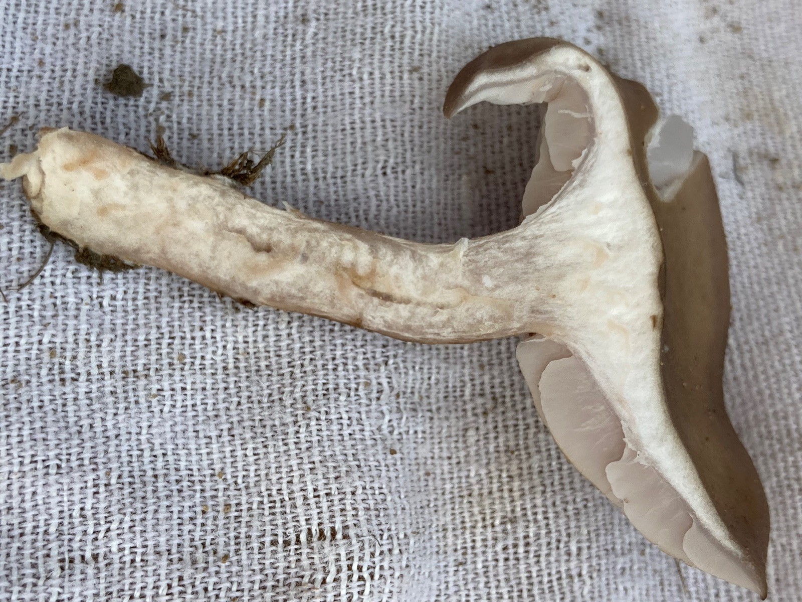 Fleisch: sehr fest, elastisch, knorpelig, weiß, im Stiel gräulich, etwas rötlich bräunend