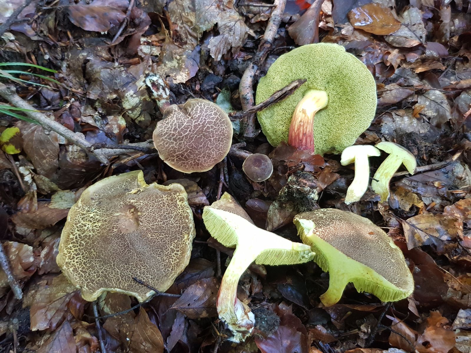 Auch wenn man einen evtl. Überbelichtungseffekt mit einbezieht, ist mir hier das Fleisch für X. pruinatus zu blass. Es müsste besonders im Stiel kräftiger gelb sein. Dafür zeigt das kleine Exemplar rechts im Schnitt in der Stielbasis den für chrysenteron typischen,, weiter oben beschriebenen Gelbbraunton. Der große Frkp. zeigt im Prinzip ein für chrysenteron typisches Schnittbild, wenn man davon absieht, dass die (variable) Rotfärbung im Bereich zwischen Stielmitte und -basis hier nur erahnbar ist.
