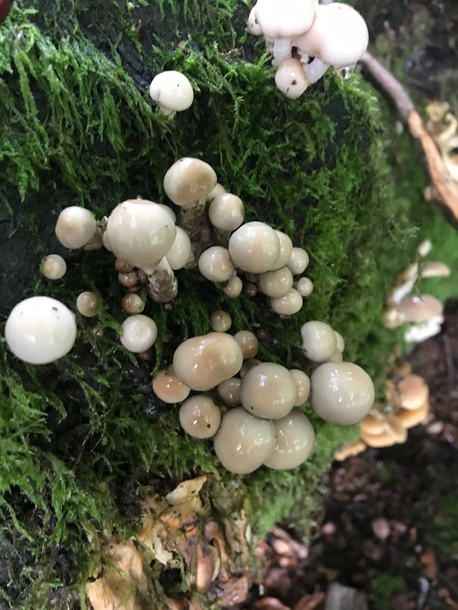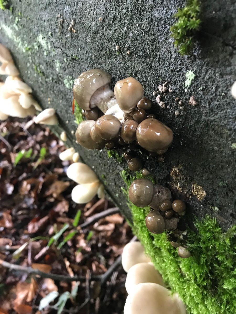 habe heute Seitlinge gesucht und kleine Pilze mit Kugelköpfen entdeckt, die sich die liegende Buche mit Seitlingen teilten.
