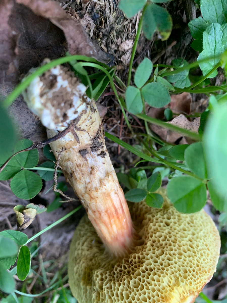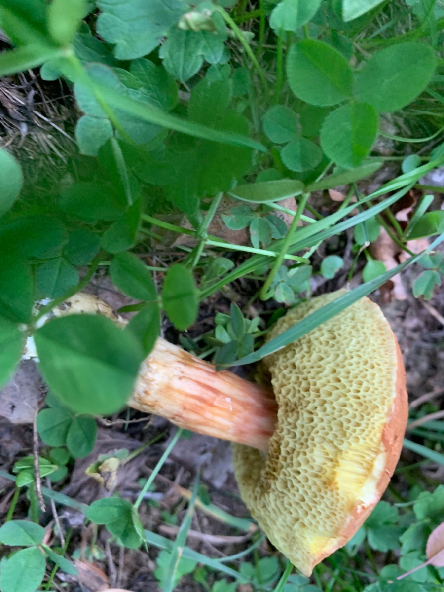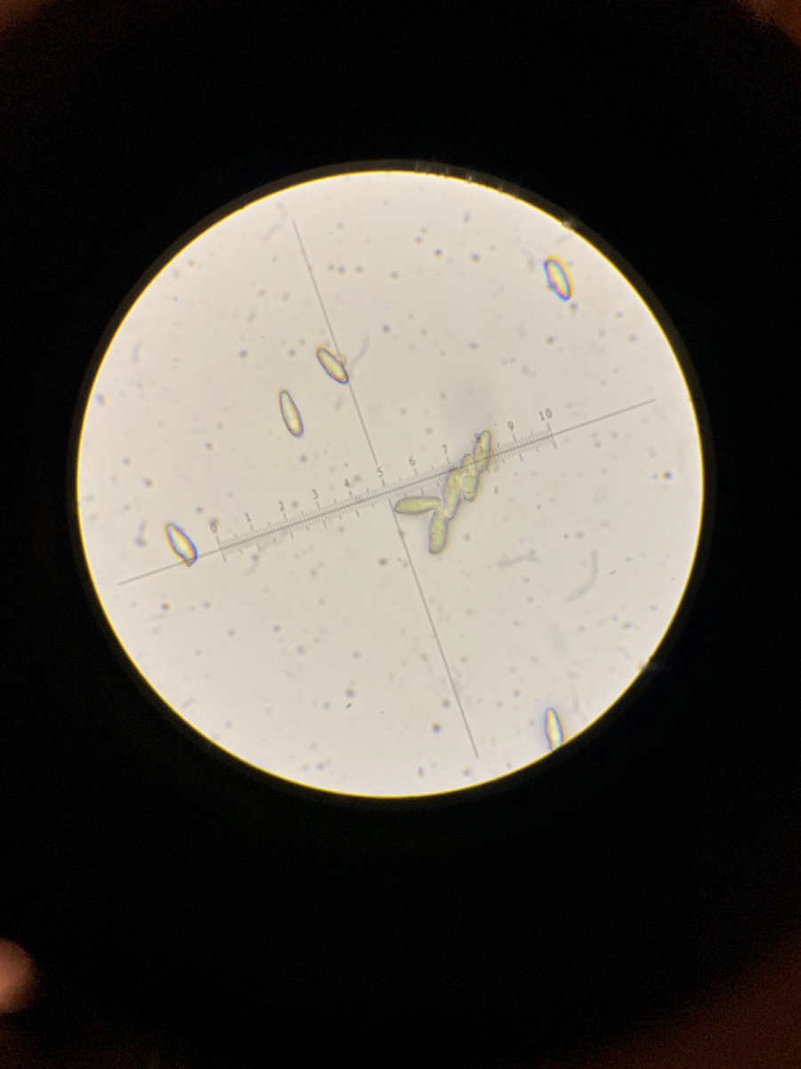 1. Als erstes gab es diesen Röhrling, ich bin mir bei dem nicht sicher ob Rotfuß oder was aus der Ziegenlippen ecke, wie unterscheide ich das denn? Ich habe ihn auch durchgeschnitten, keine Ahnung warum ich davon kein Bild habe, hab den Pilz zwar noch, aber ist jetzt zu eingetrocknet. Der Schnitt war im Stiel rötlich, im Hutfleisch auch schwach bläulich, die Röhren blauen auf Druck. Ich klatsch die Sporen mal mit dran, vielleicht hilfts, aber mein Mikroskopierkurs steht noch aus (Vergrößerung x1000).