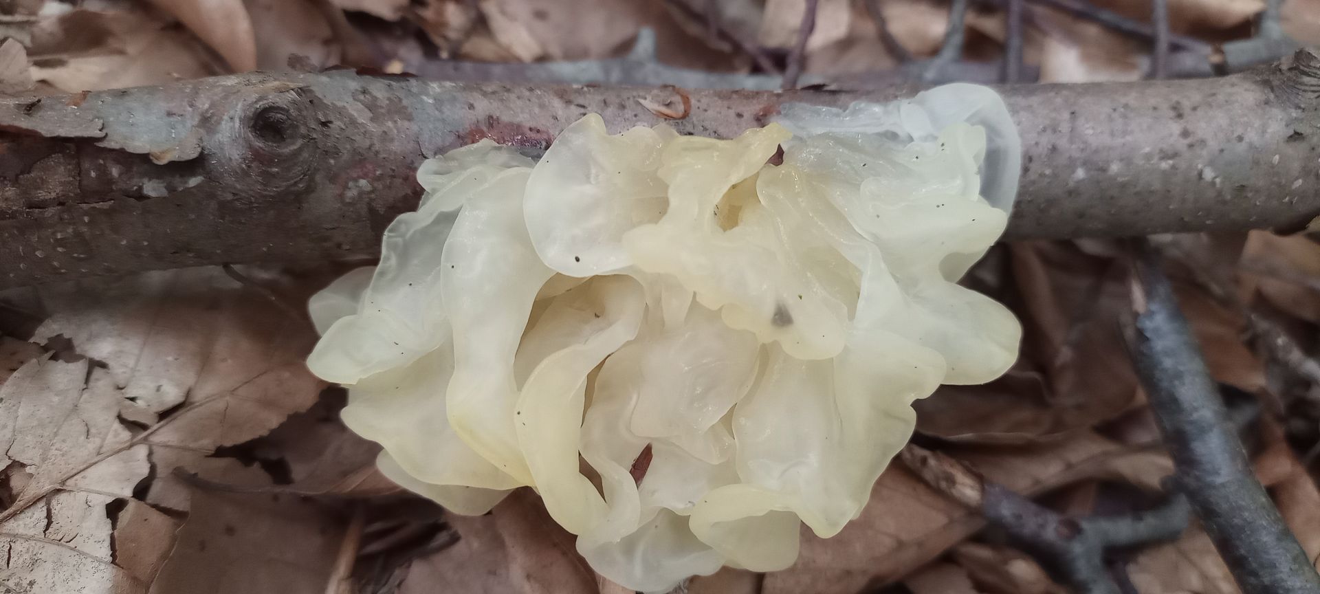 ich habe letzte Woche an einem Laubholzast (ich vermute Buche oder Hainbuche) einen Fruchtkörper gefunden, der mich spontan an den Goldgelben Zitterling (Tremella mesenterica) erinnert hat, nur war der überraschender Weise nicht goldgelb, sondern fast klar mit nur einem Hauch von gelb. Meine Recherchen haben ergeben, dass es sich möglicher Weise um eine farbliche Variation von T. mesenterica handelt, der z.T. auch als Kristall Zitterling bezeichnet wird.