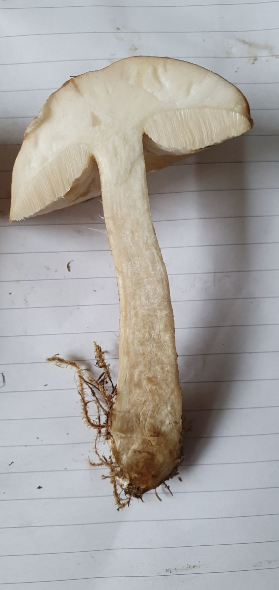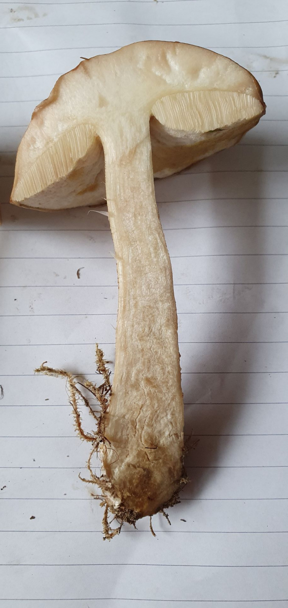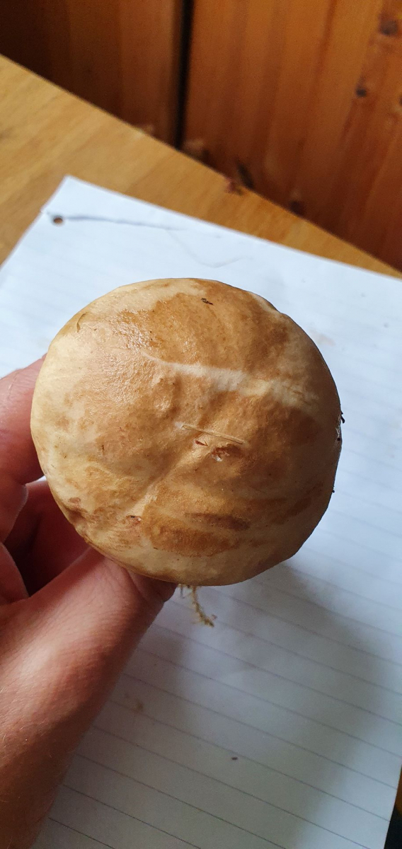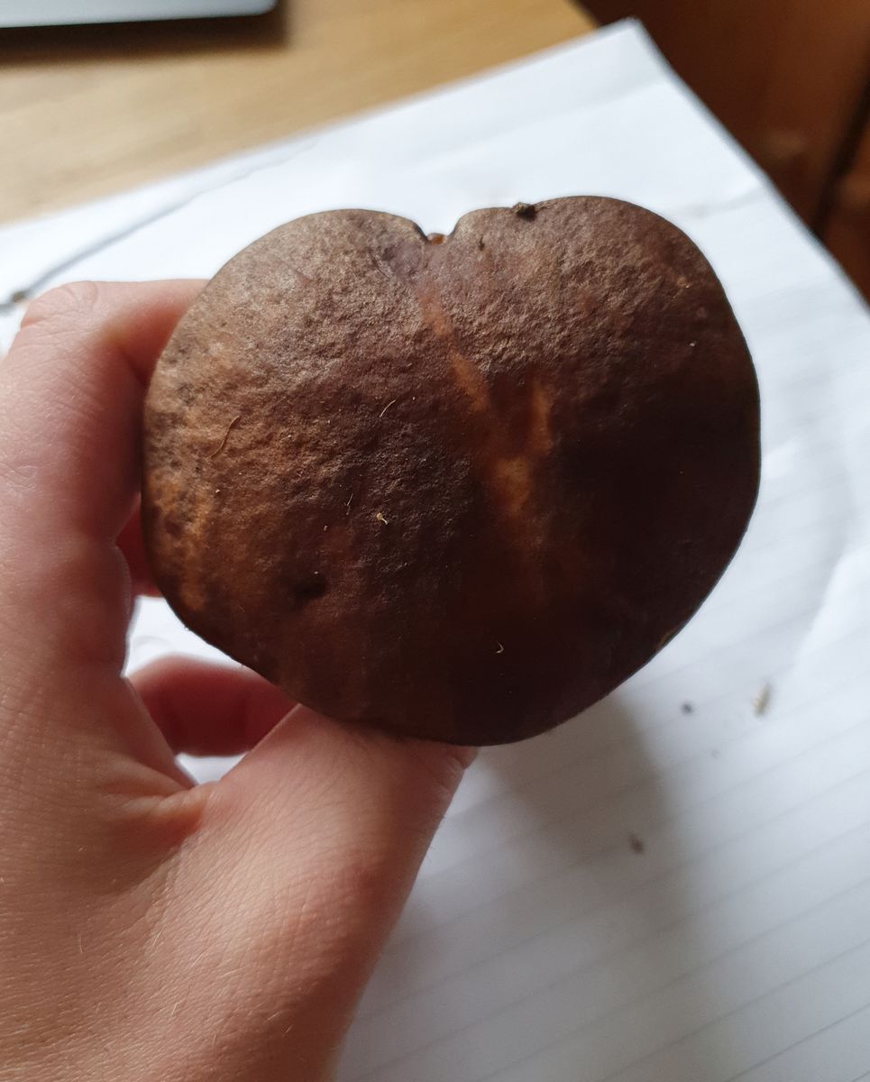 Aufgeschnitten. Außen feste, innen weich, pilziger Geruch