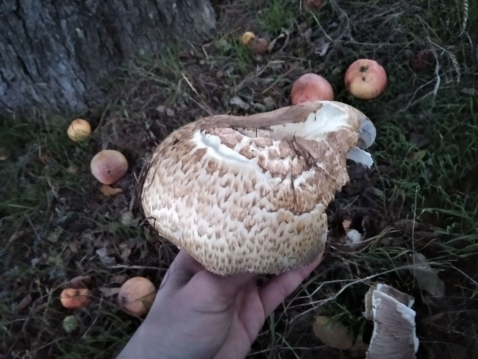 Hallo, dieser Pilz wächst bei mir schon länger wer kann ihn einordnen? Hier was ich weiß. Der Hut hat keine Schuppen. Er rötet stark beim Anschnitt, siehe Photo. Der Geruch ist unauffällig bis ganz leicht 'waldig, muffig', irgendwo im Zwischenbereich 'angenehm' und 'unangenehm'. Der Hut öffnet sich anscheinend nur sehr langsam, habe die noch nie mit offenem Hut gesehen.