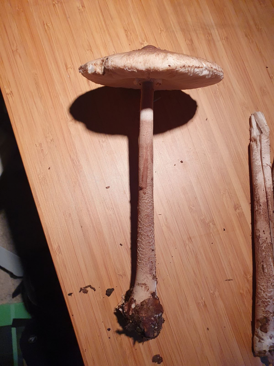 Gegen den Parasol spricht das Röten im Stiel, aber zu den Safranschirmlingen passt er auch nicht so recht, aufgrund der Natterung... Zitzen-Riesenschirmling vielleicht? Oder habe ich es am Ende mit verschiedenen Arten zu tun? Ich bin verwirrt😵💫