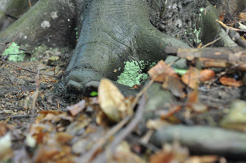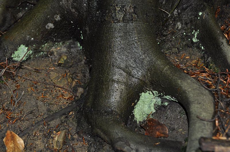 Beim mühsamen Matschtreten im Wald ist mir aufgefallen, dass viele Bäume an der Stammbasis grüne Flecken aufweisen. Es sieht aus wie Schimmelpilz und ist von der Konsistenz her eher schmierig: