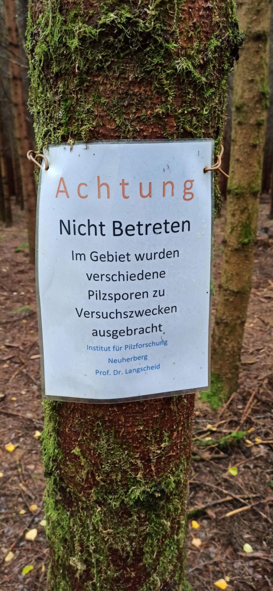nach kurzer Recherche kam ich zu dem Schluss, dass es sich bei dem Hinweisschild tatsächlich um eine ernst gemeinte Studie handeln könnte. Google-Maps führte mich direkt zum Helmholtz-Institut für Gesundheit und Umwelt, was eine Feldstudie zum Thema Pilze nichht abwegig erscheinen lässt. Auch das mit den Pilzsporen finde ich nicht absurd, da Sporen Beispeilsweise relativ einfach durch alte Fruchtkörper, welche am Boden/Totholz liegend (evtl. sogar mit etwas Erde, oder Nadelstreu bedeckt) einfach ausgebracht werden können. So ähnlich schaffte ich es auch bei mir auf dem Balkon, rötliche Lacktrichterlinge in einem Topf mit Esskastanie anzusiedeln.