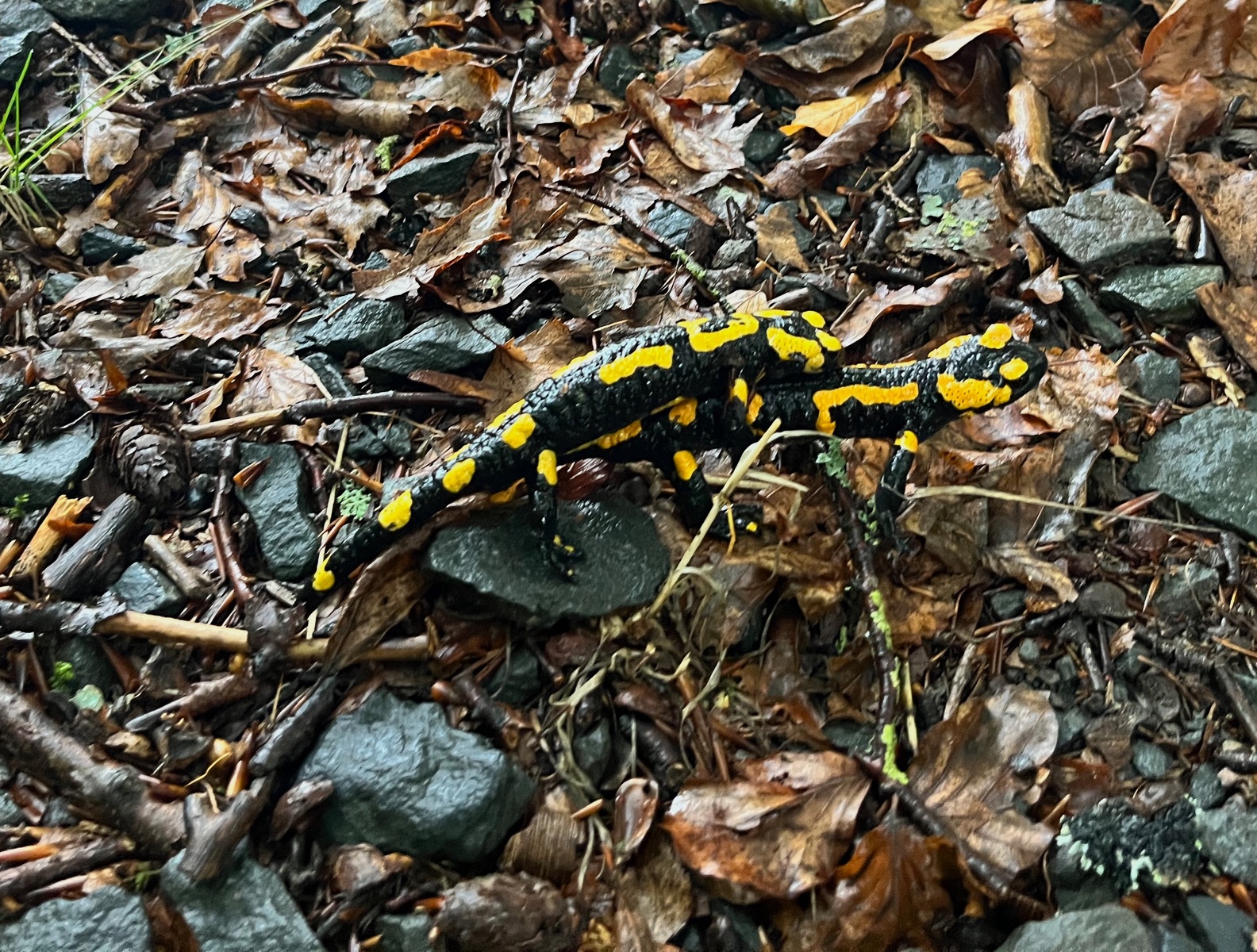 die Überschrift kann man so oder so lesen. Aber ich habe bei der Gassirunde im Regen eben 5 Feuersalamander getroffen, die auch gerade unterwegs waren. Aber nicht nur das. Auch eine Salamander-Hochzeit konnte ich beobachten. Oder zumindest den Versuch einer Paarung. Frau Salamander hat den Aufdringling am Ende abgeworfen.