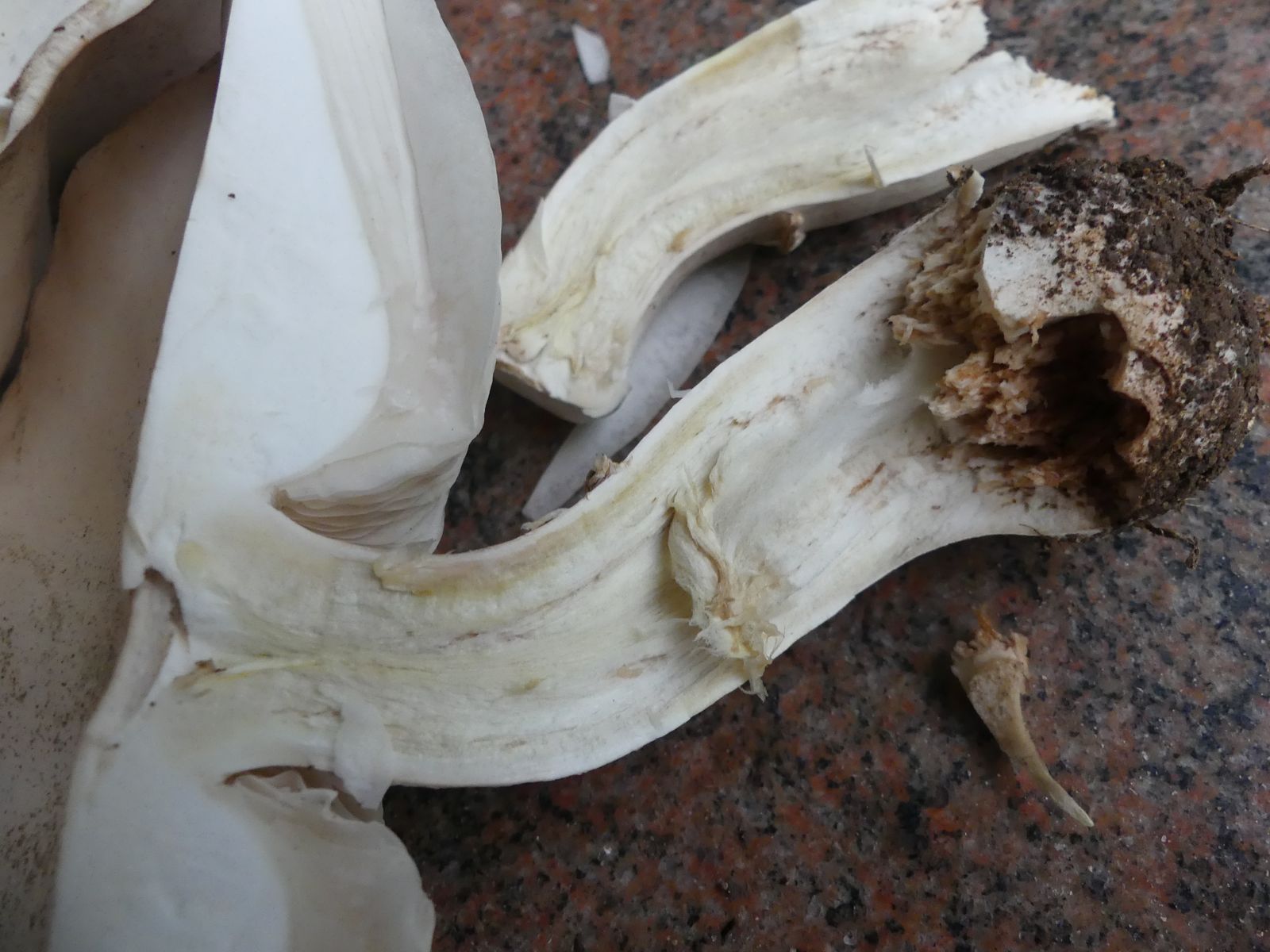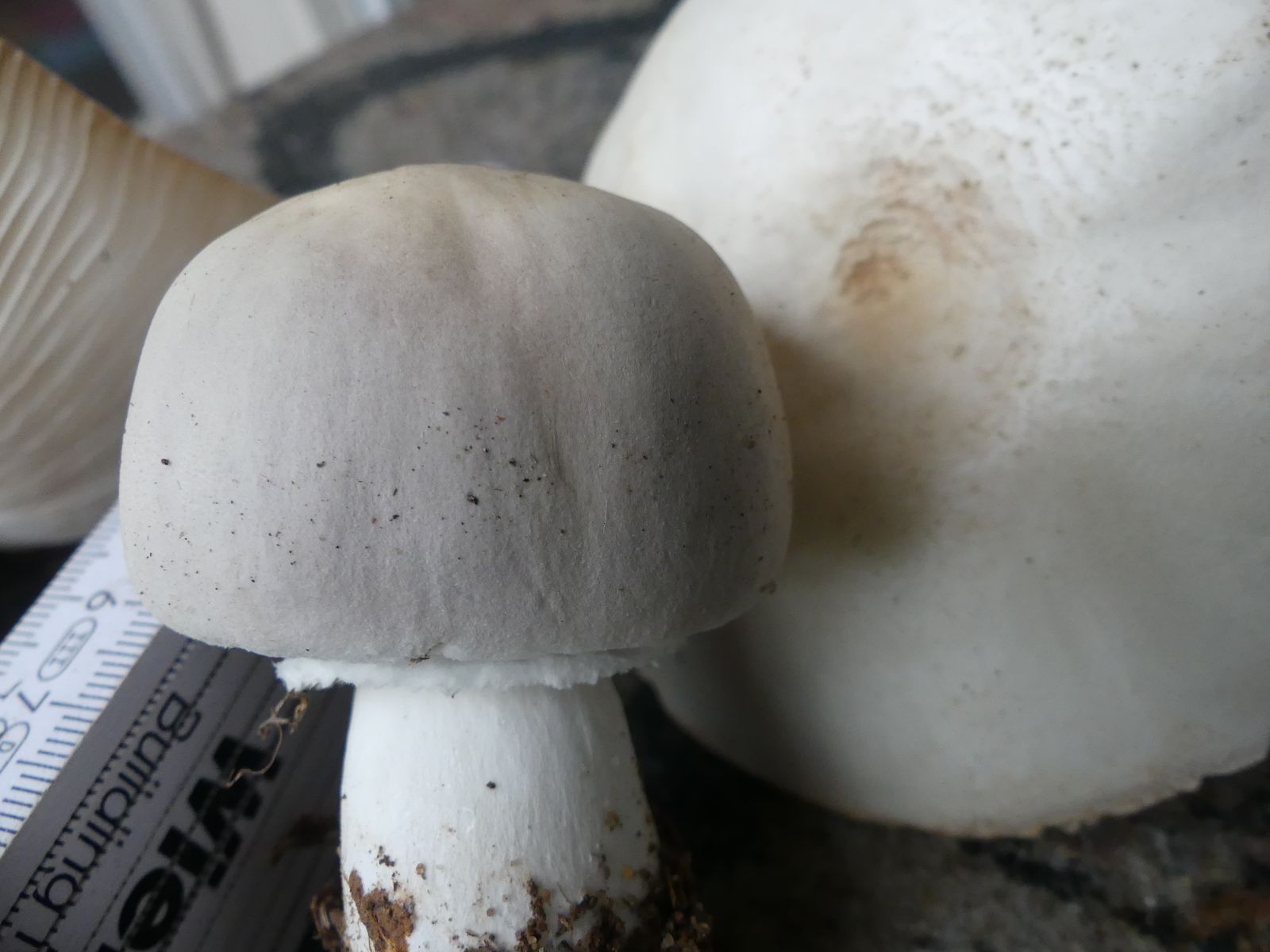 Leucoagaricus leucothites hatte ich schon ein paar Mal gefunden und als relativ kleinen und zierlichen Pilz in Erinnerung, mit fast reinweißem Hut und dünnem Stiel. Diese Exemplare hier sind richtig dicke Klopper, Hutdurchmesser bis 17 cm, Stiel bis 4 cm dick. Das junge kugelige Exemplar hat einen deutlich grauviolettlichen Hauch auf dem Hut in Richtung Hutrand, das war bei meinen bisherigen Kollektionen auch nicht der Fall.