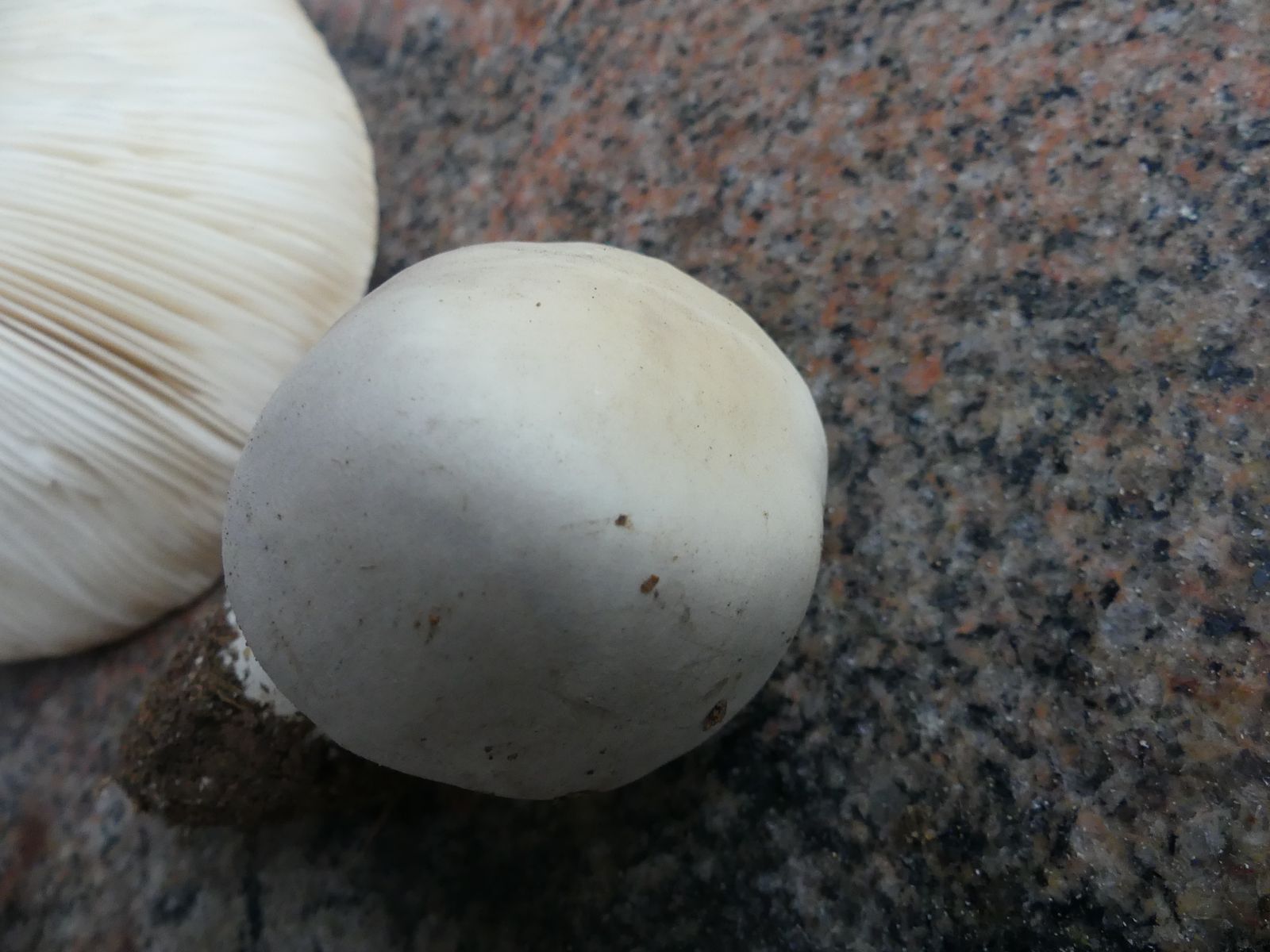 Leucoagaricus leucothites hatte ich schon ein paar Mal gefunden und als relativ kleinen und zierlichen Pilz in Erinnerung, mit fast reinweißem Hut und dünnem Stiel. Diese Exemplare hier sind richtig dicke Klopper, Hutdurchmesser bis 17 cm, Stiel bis 4 cm dick. Das junge kugelige Exemplar hat einen deutlich grauviolettlichen Hauch auf dem Hut in Richtung Hutrand, das war bei meinen bisherigen Kollektionen auch nicht der Fall.