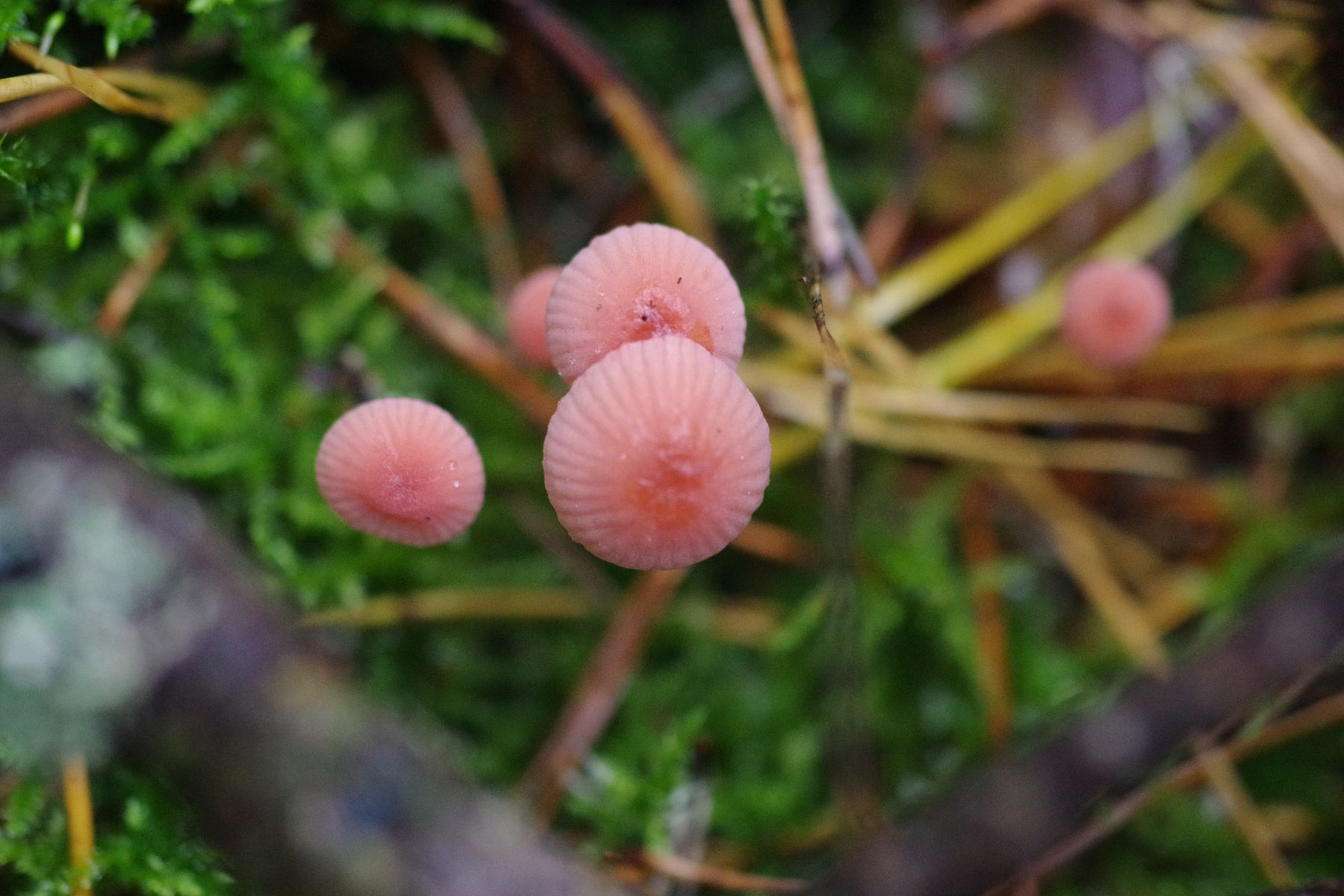 unter jungen Fichten und Kiefern wächst dieser kleine (bia 15 mm) rosa Helmling mit rosa Lamellen und farbigen Lamellenkanten. Hier komme ich zu Mycena rosella, der im Land als sehr häugig angegeben wird.