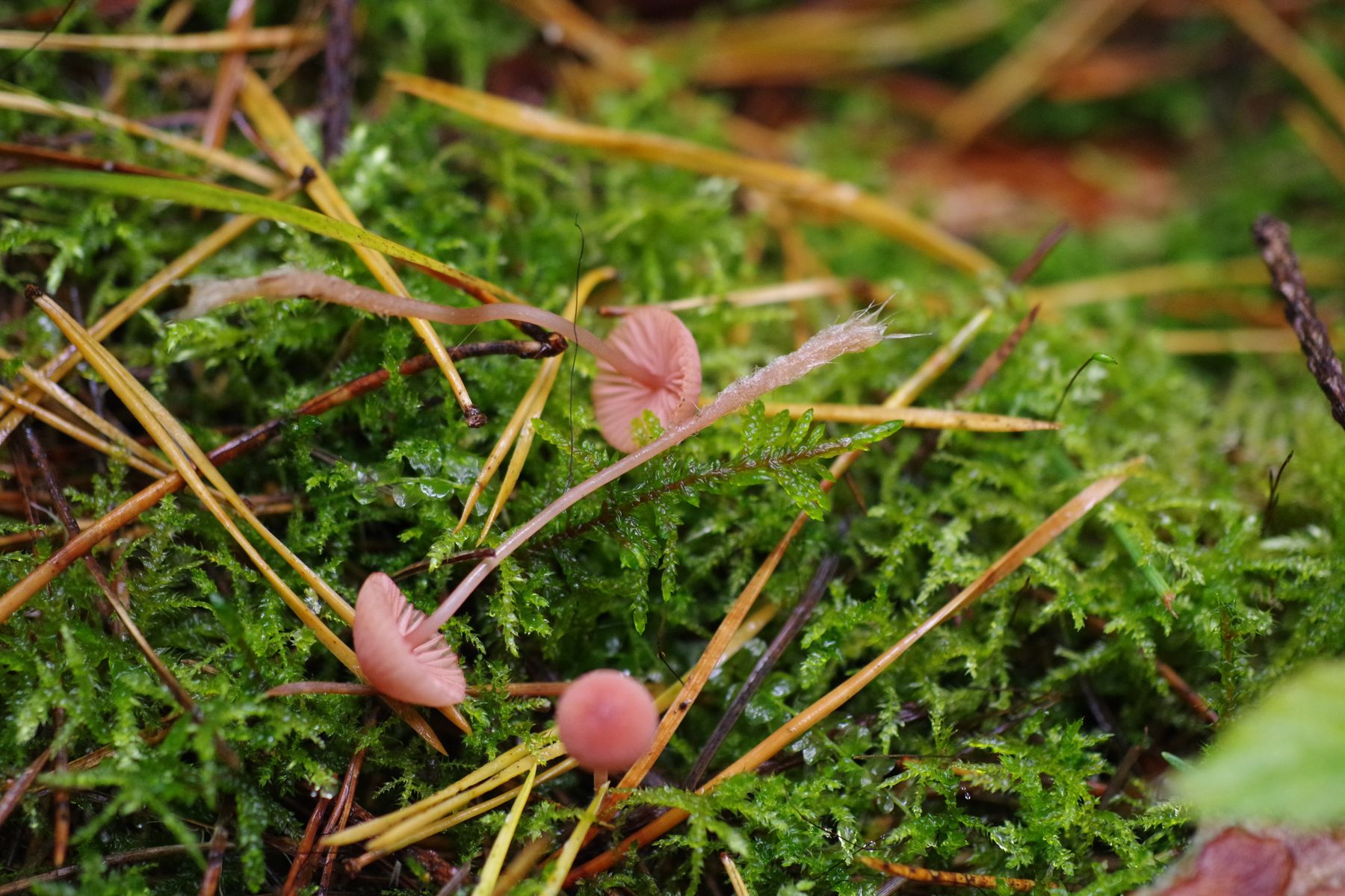 unter jungen Fichten und Kiefern wächst dieser kleine (bia 15 mm) rosa Helmling mit rosa Lamellen und farbigen Lamellenkanten. Hier komme ich zu Mycena rosella, der im Land als sehr häugig angegeben wird.