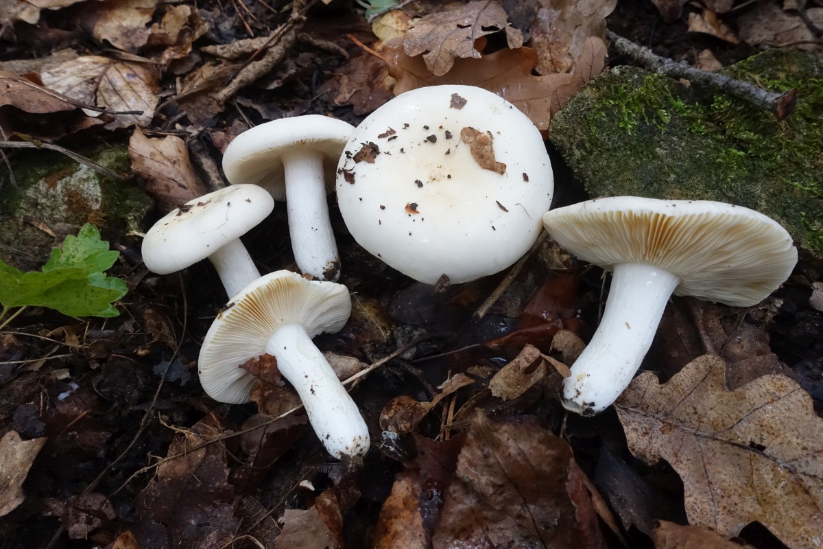 Der Hut mehr oder weniger weiß. Selbst junge Fruchtkörper sind extrem hell und werden im Alter allenfalls in der Mitte leicht creme-farben; keine überhauchten Grüne- Rot- oder Lilatöne. Ebenso weiß die Lamellen und der Stiel. Das Spp. habe ich nicht genauer untersucht, aber bei älteren Fruchtkörpern fallen deutlich gelblich verfärbte Lamellen auf - die Spp-Farbe wird also eher im dunklen creme- bis gelblichen Bereich liegen. Bei einer Kostprobe konnte ich eine sehr dezente Schärfe in den Lamellen feststellen. Geruch für mich typisch Täubling ohne eine besondere Note (allerdings nicht intensiv geprüft). Fundort ist ein eichendominierter Laubwald mit eingestreuten Hainbuchen und Elsbeeren und anderem Gebäum.